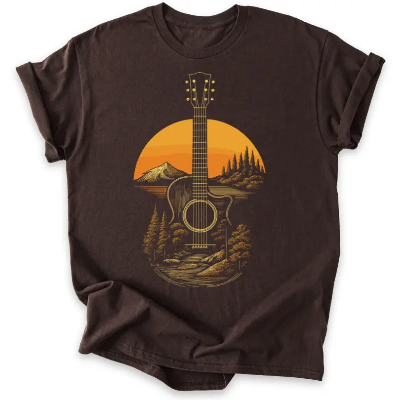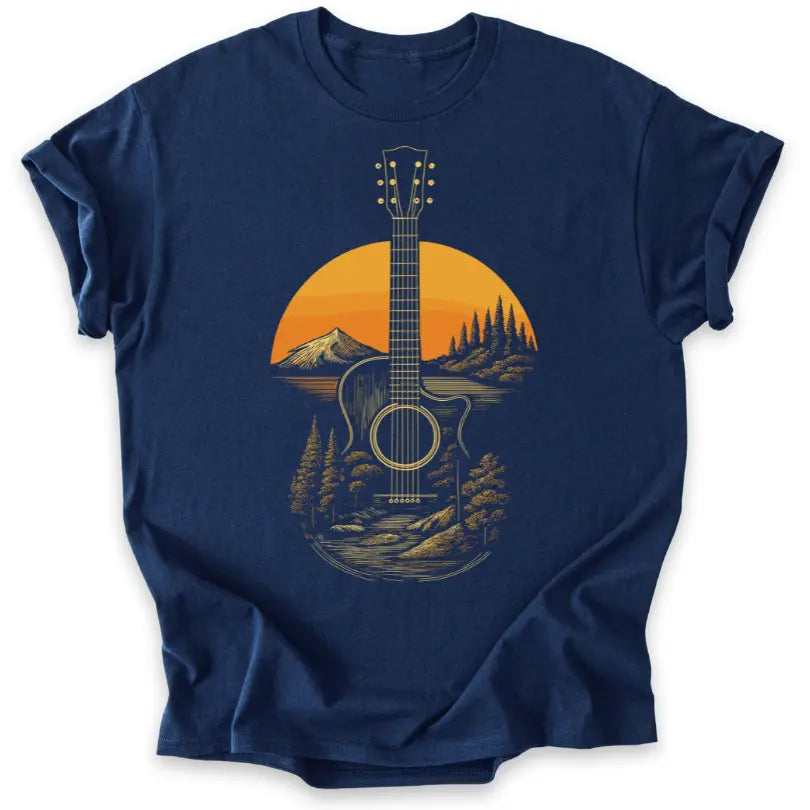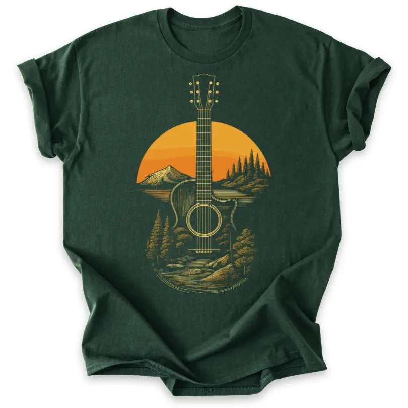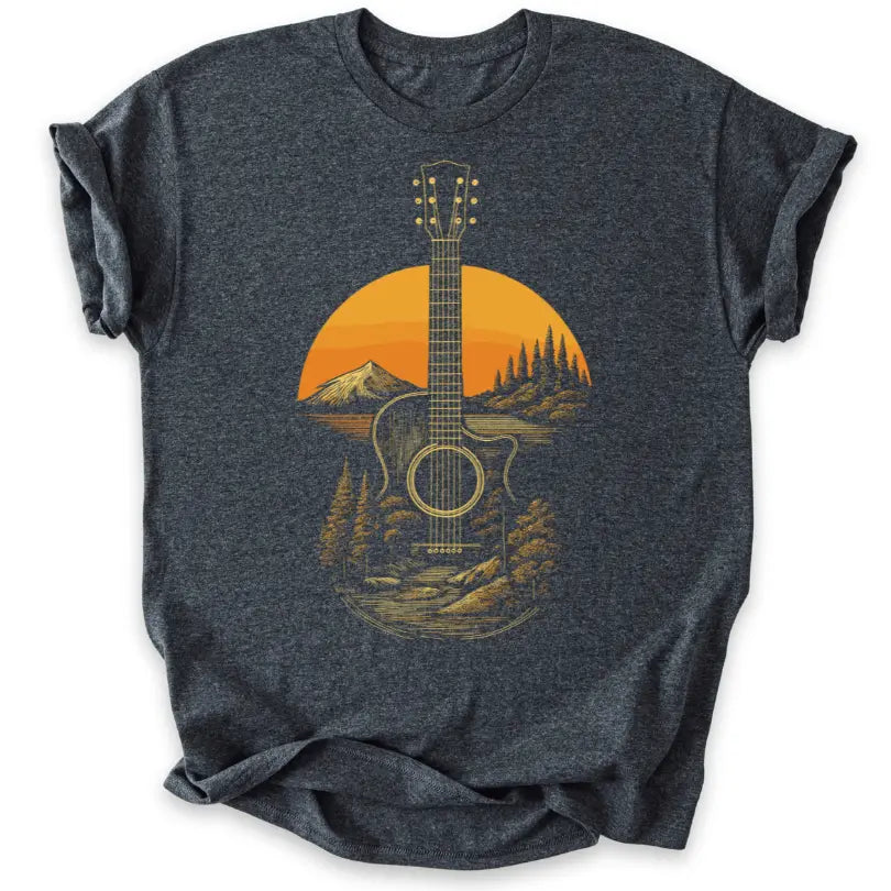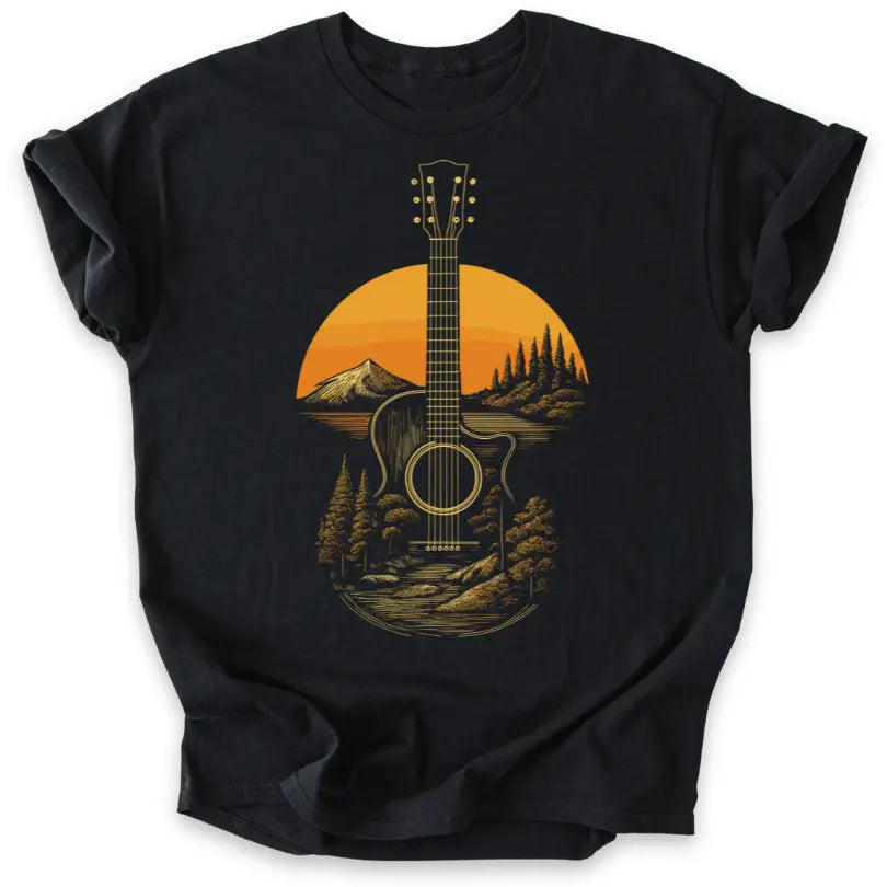 Musik trifft Natur – dieses Shirt vereint Gitarre, Berge und Sonnenuntergang in einem einzigartigen Design.
