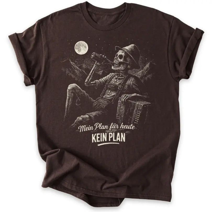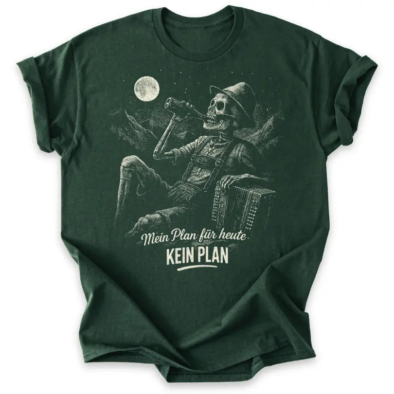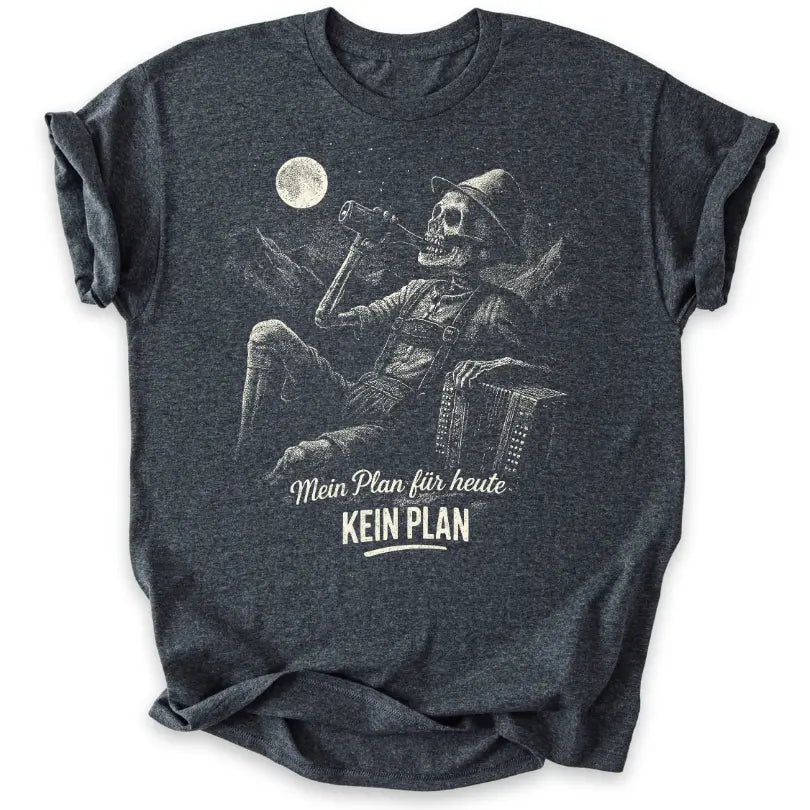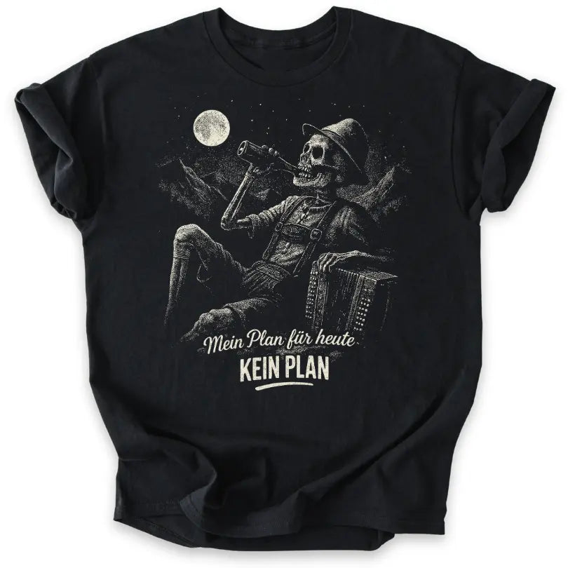 Dieses T-Shirt zeigt ein entspanntes Skelett im Trachtenlook, das unter dem Mond Akkordeon spielt und das Leben nicht zu ernst nimmt.