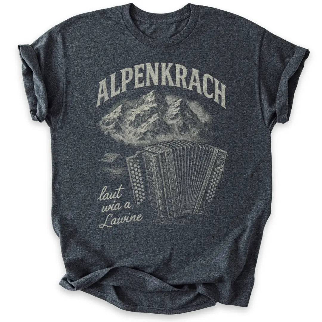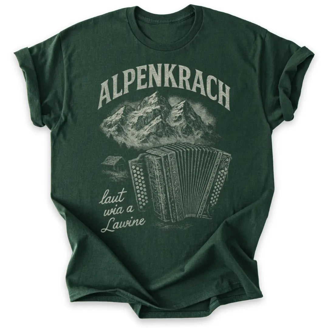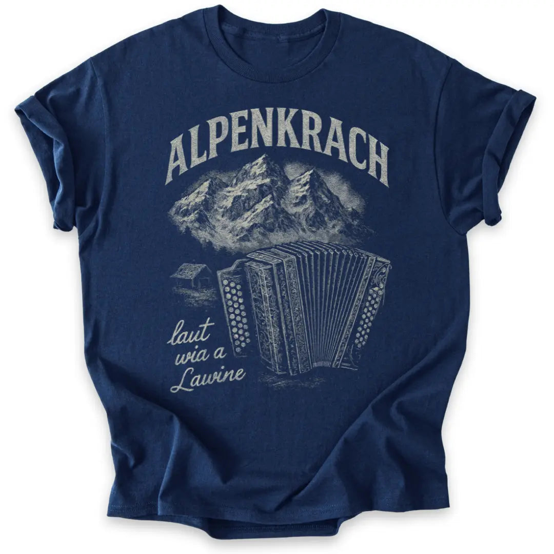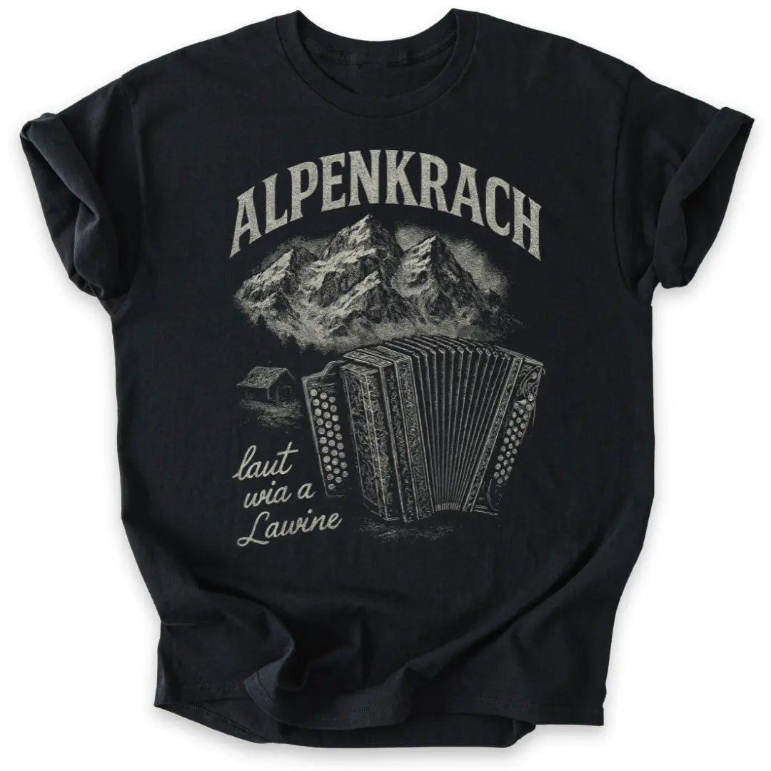 Wenn die Berge beben und das Herz im Takt der Ziehharmonika schlägt – dann ist „Alpenkrach“ angesagt. Dieses T-Shirt ist ein kraftvolles Statement für alle, die den urigen Sound der Alpen lieben.