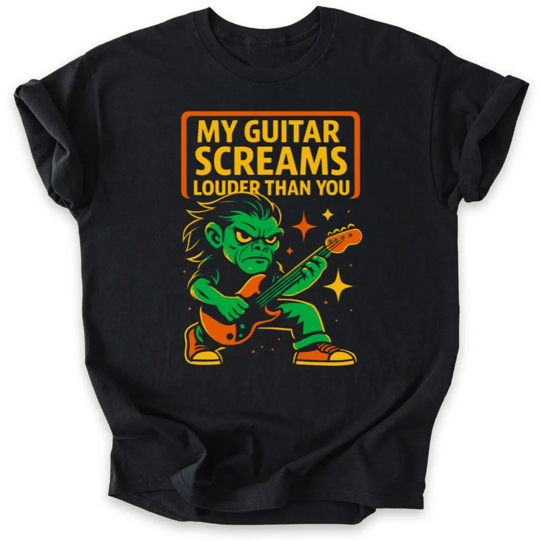 📦 Auch als Geschenk-T-Shirt für Gitarren-Freaks, Lautstärkefans & Comic-Rocker:innen ideal.