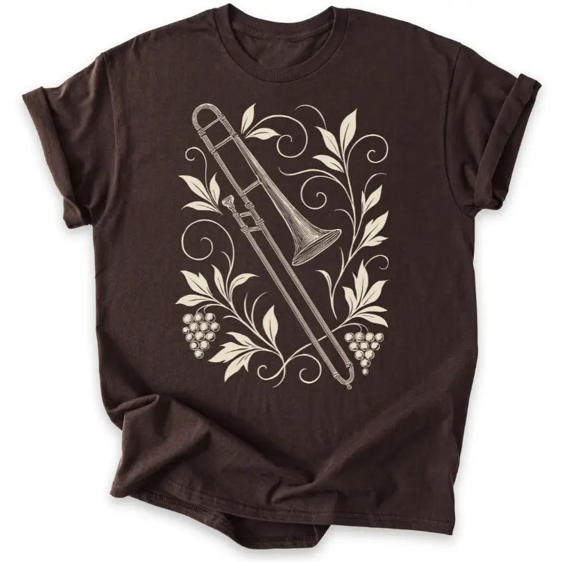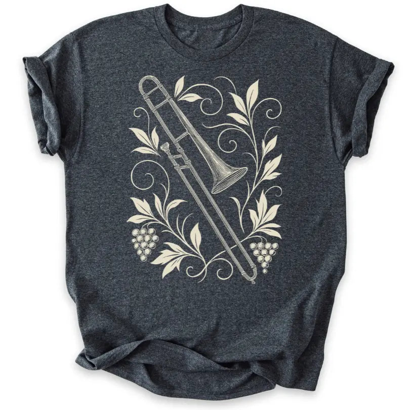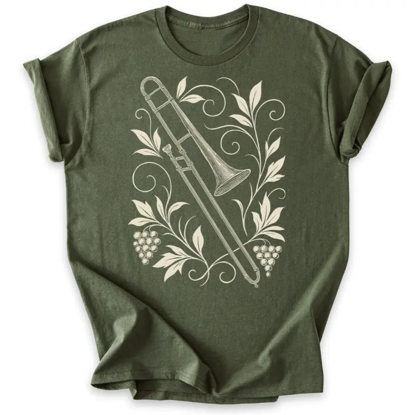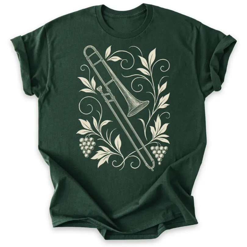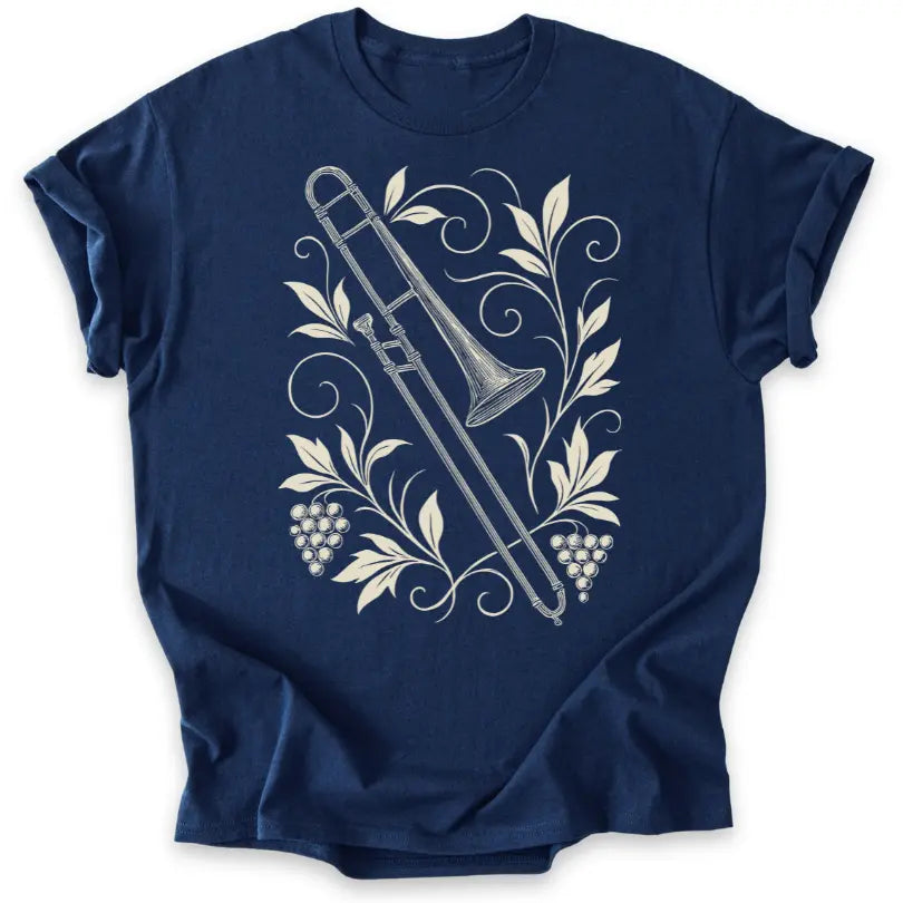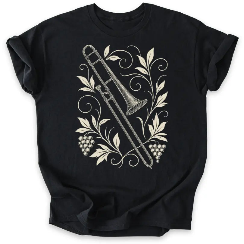 Dieses T-Shirt zeigt die Posaune in ihrer schönsten Form: umrahmt von Weinlaub und Tradition.