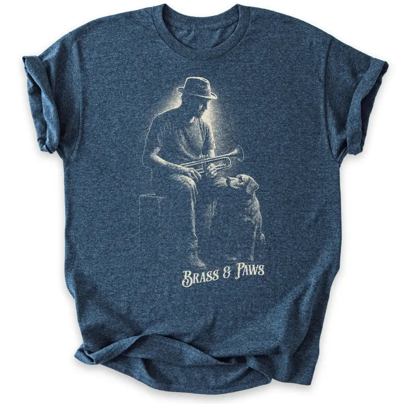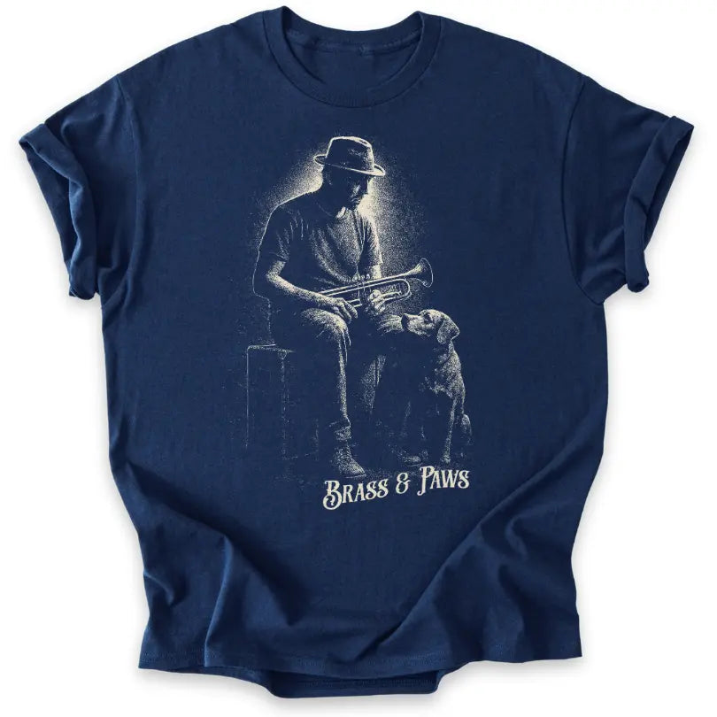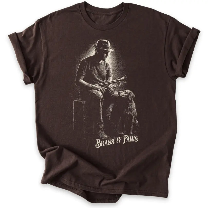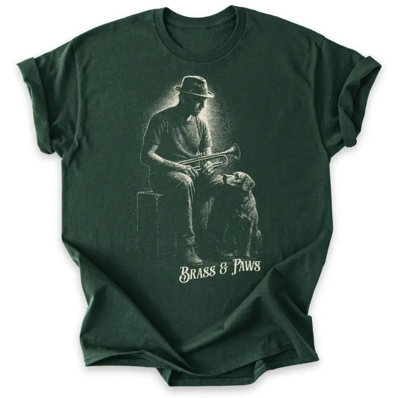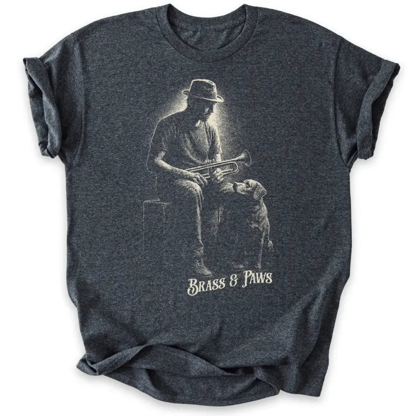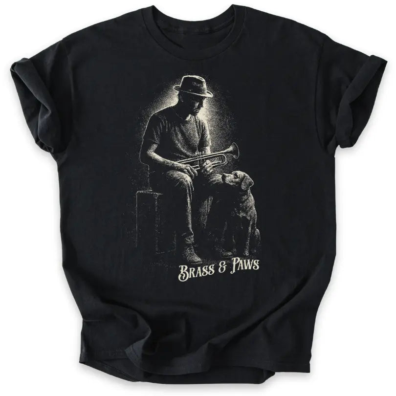 „Brass & Paws“ – dieses T-Shirt feiert die besondere Harmonie zwischen Musik und Freundschaft.