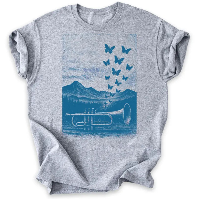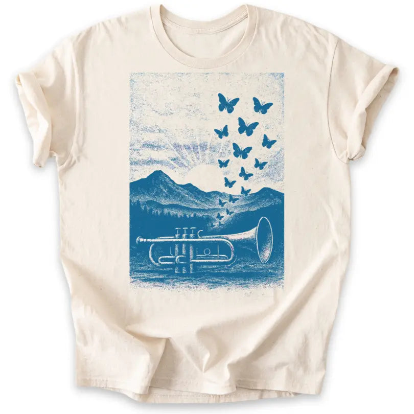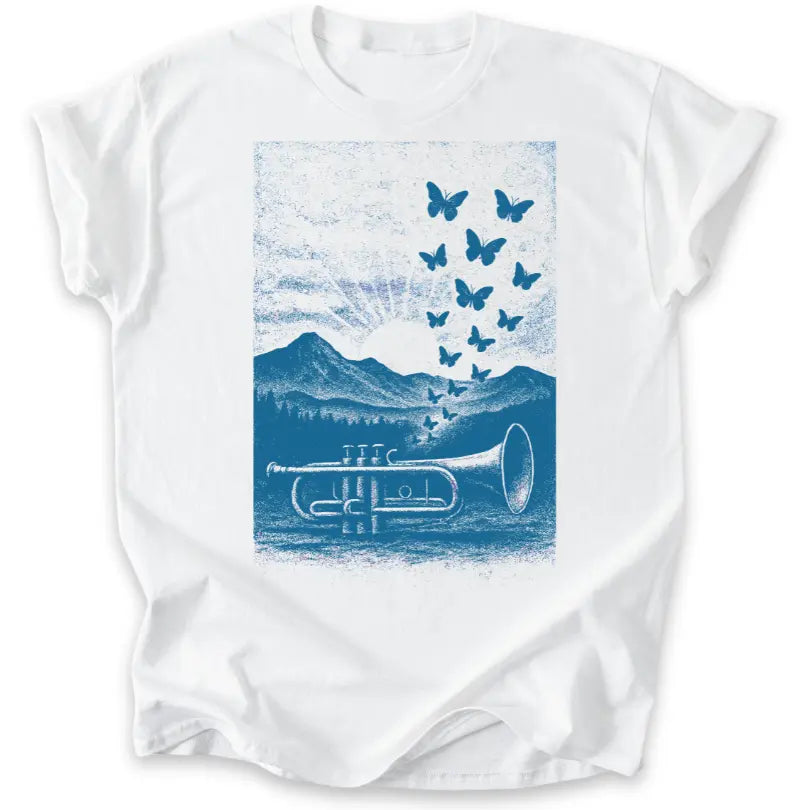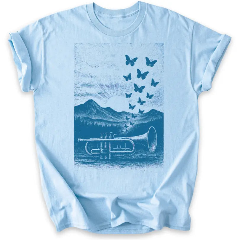Dieses T-Shirt verbindet Natur, Sonnenaufgang und den warmen Klang des Blechs zu einem harmonischen Kunstwerk.