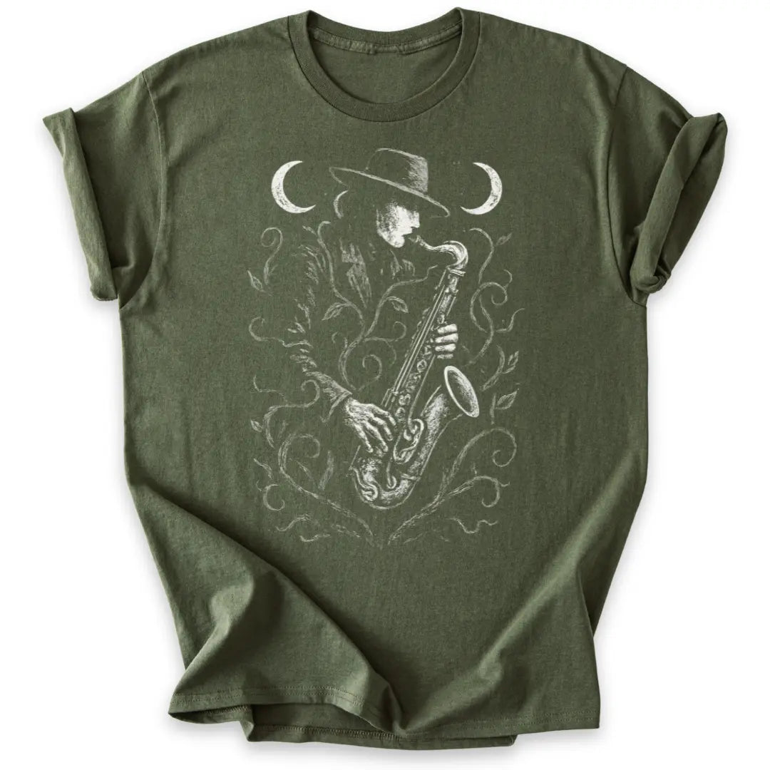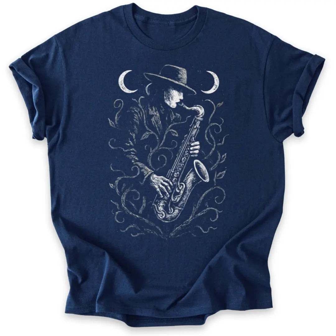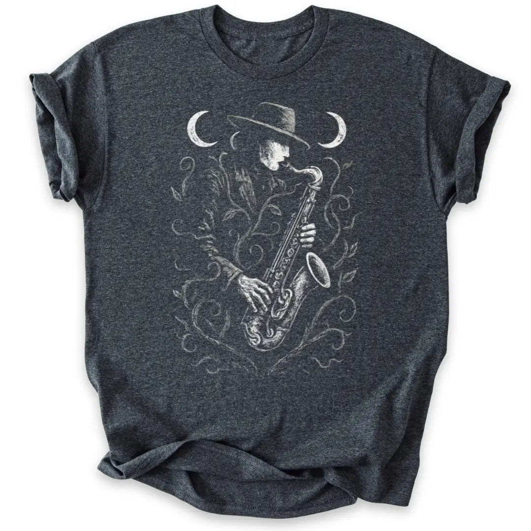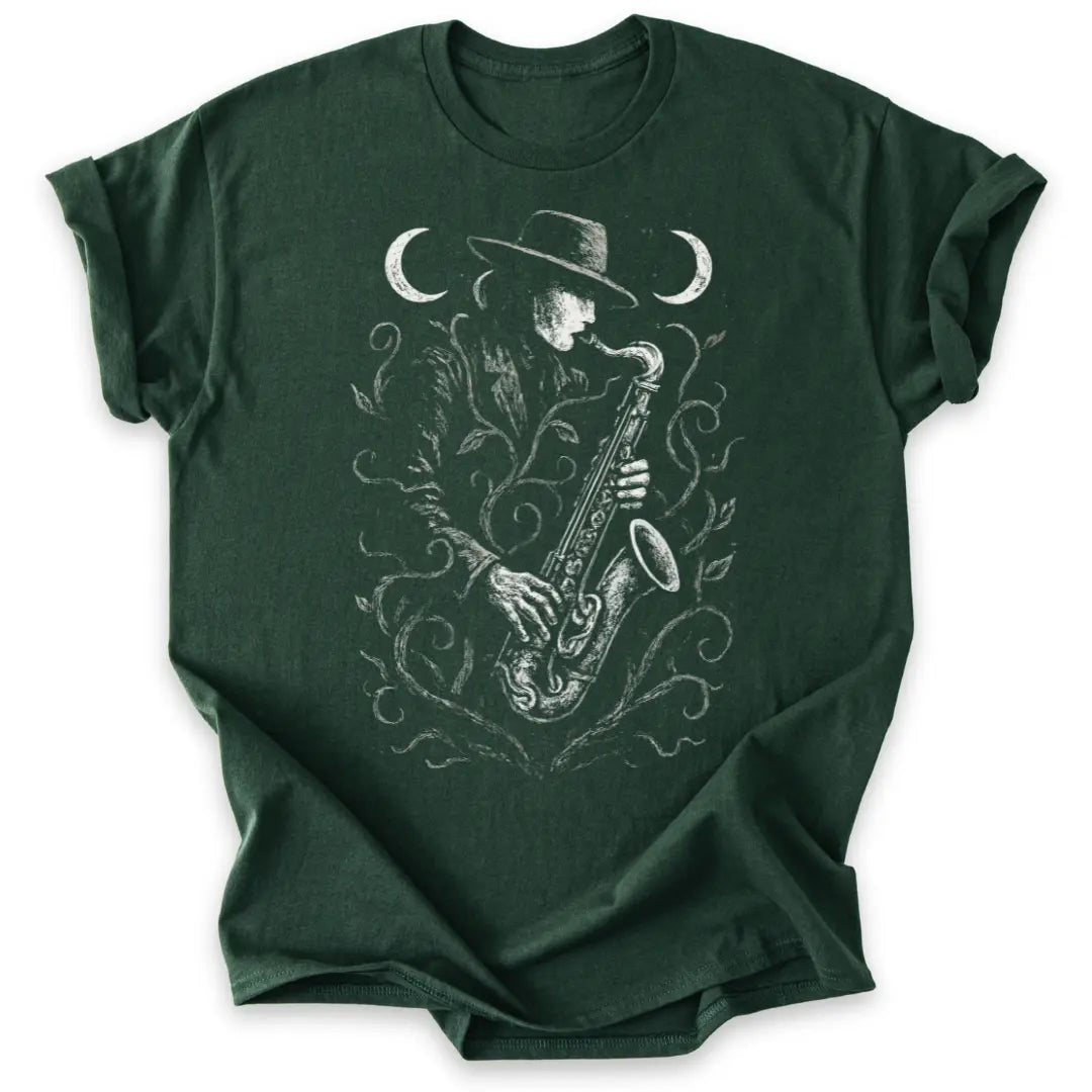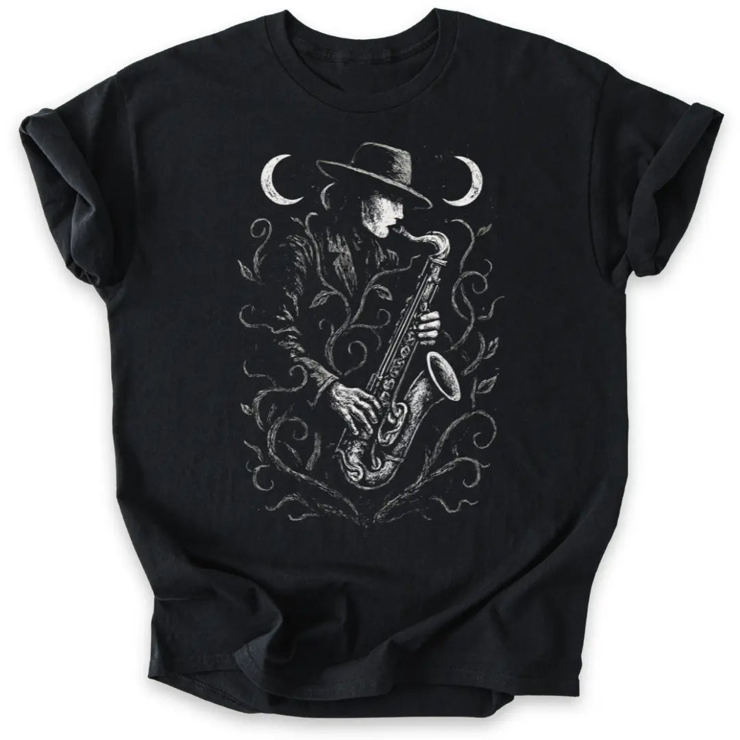 Der Saxophonspieler im Anzug, umrankt von mystischen Pflanzen, spielt seine Melodie zwischen zwei Mondsicheln.