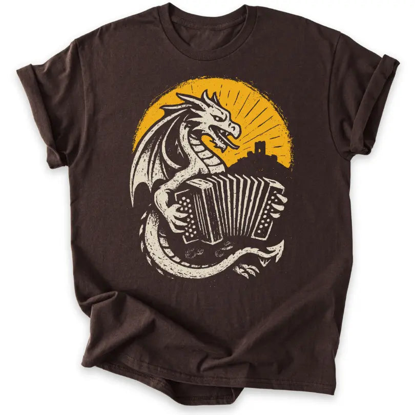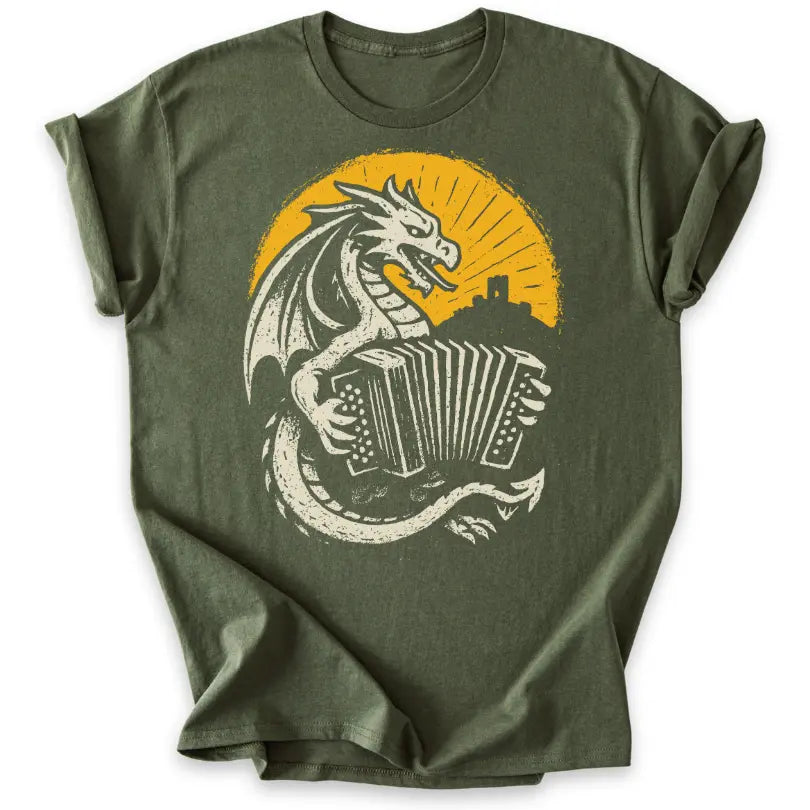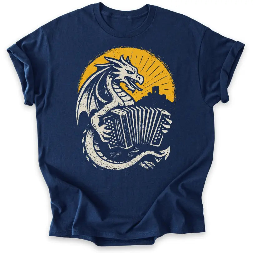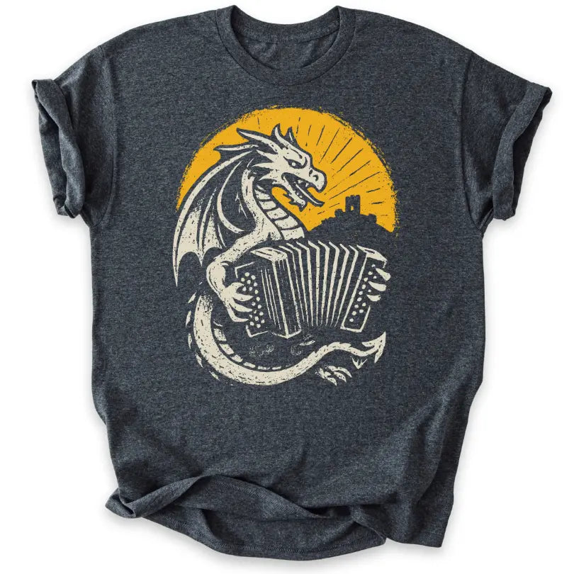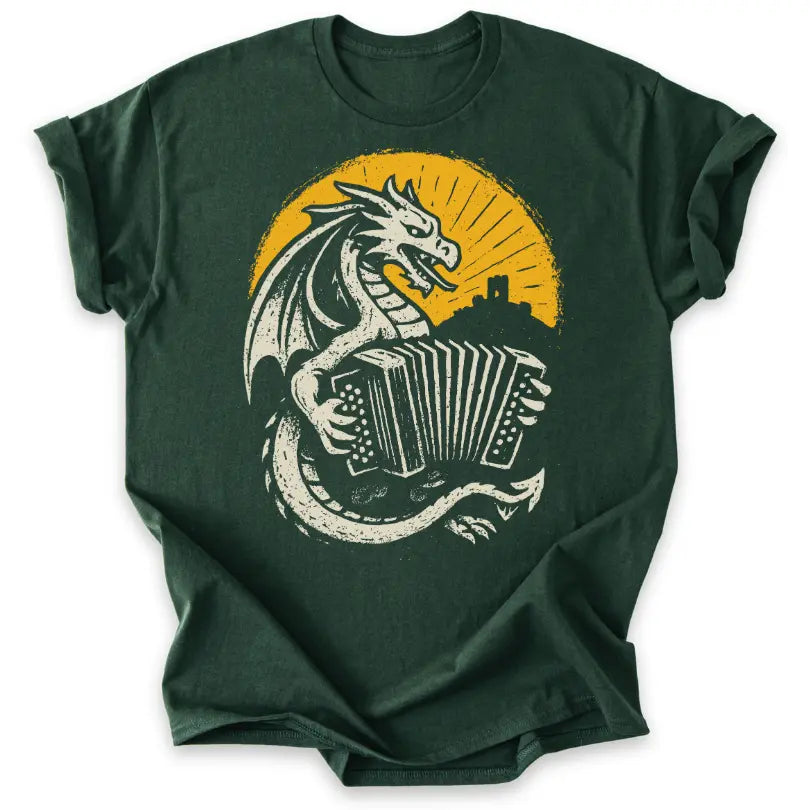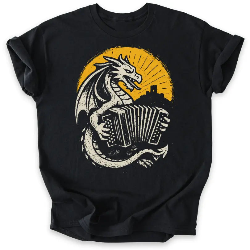 📦 Auch als Geschenk-T-Shirt für Festivalgänger:innen, Akkordeonspieler:innen & Drachenfans perfekt.