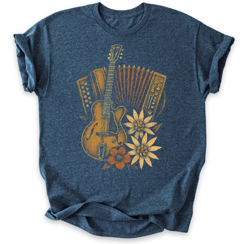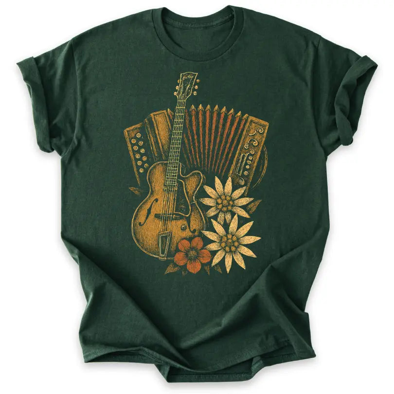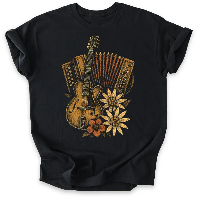 📦 Ideal als Geschenk-T-Shirt für Gitarrist:innen, Harmonikaspieler:innen & Volksmusikfans mit Herz.