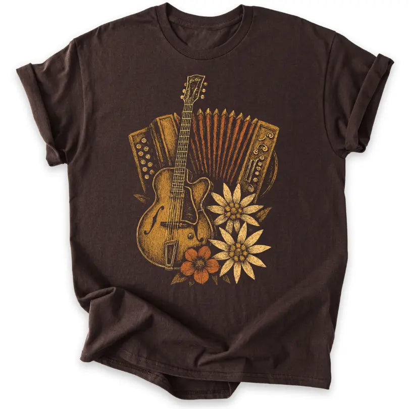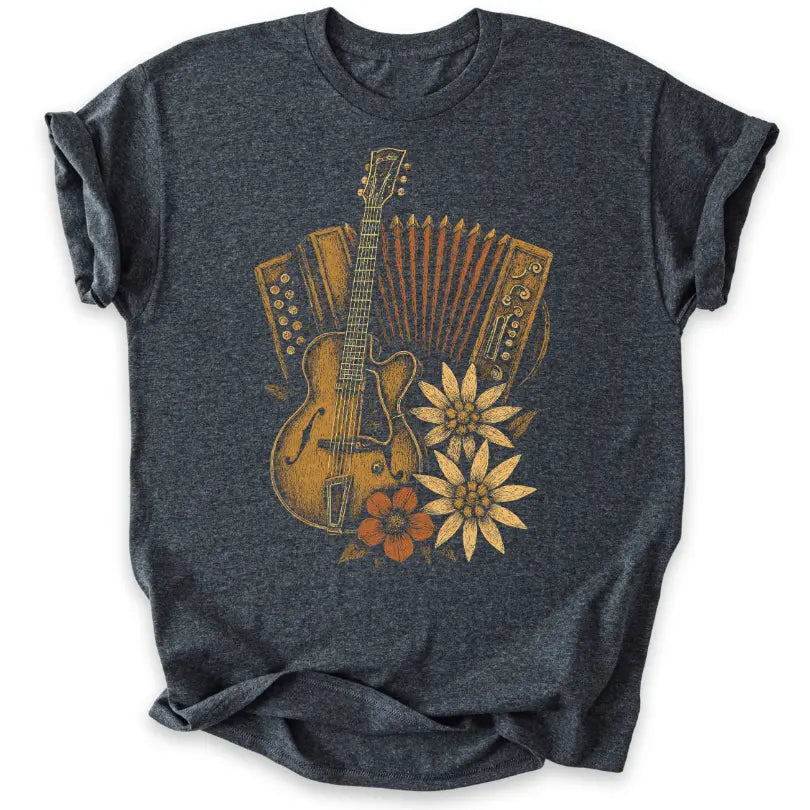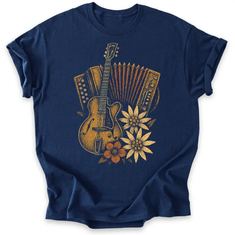 Wenn zwei Instrumente zum perfekten Duo werden – dieses T-Shirt feiert das Dream Team aus Gitarre und Harmonika.