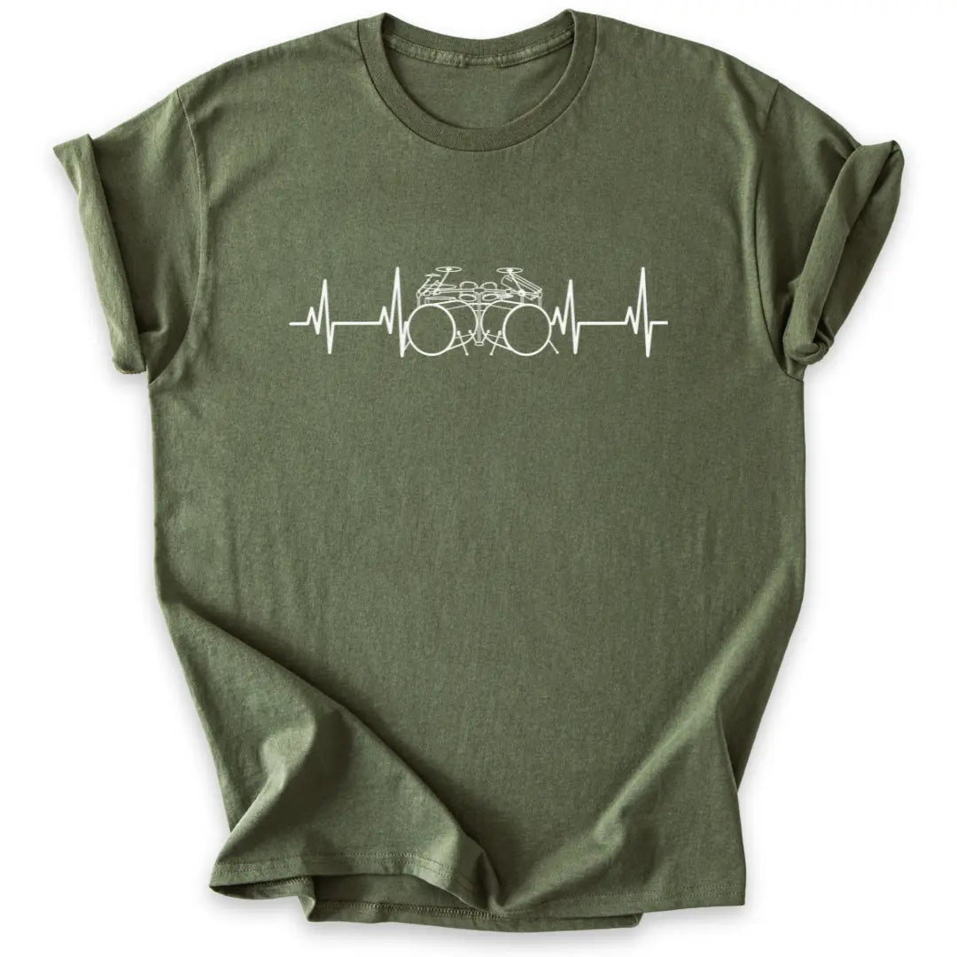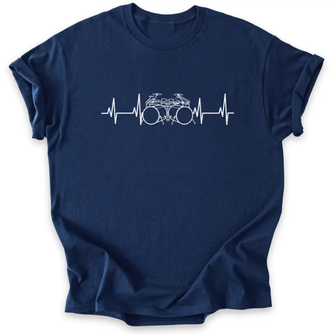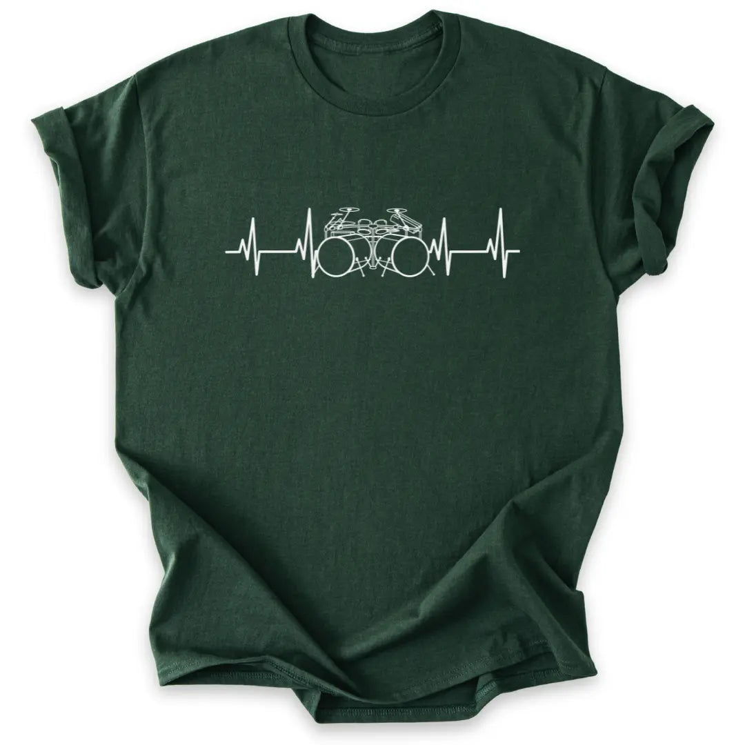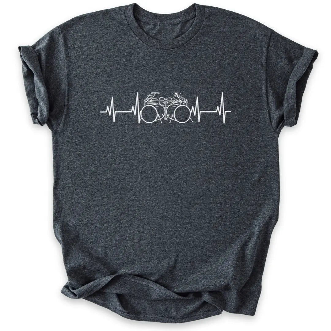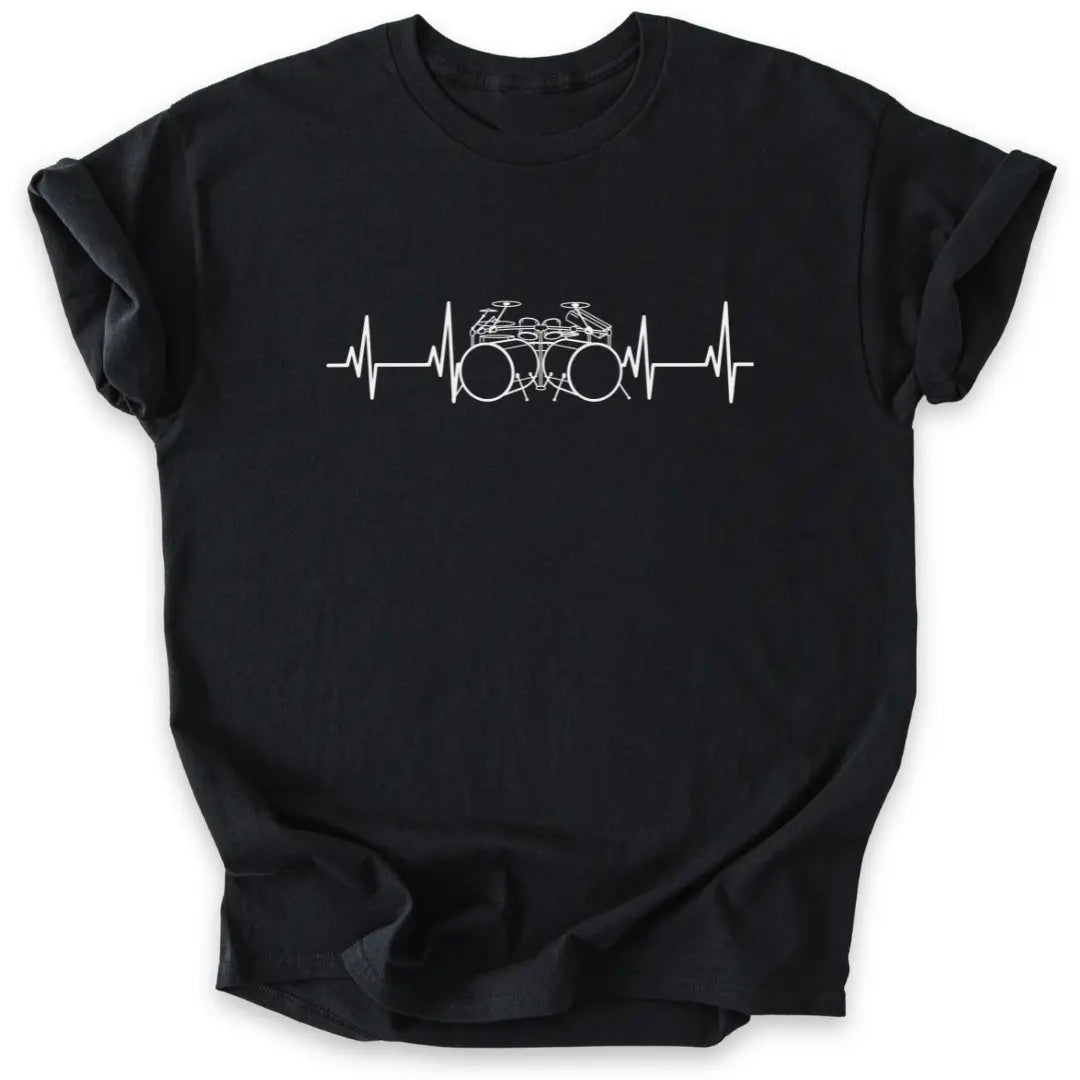 Dieses T-Shirt verbindet eine EKG-Linie mit einem mächtigen Doublekick-Drumset – perfekt für Drummer:innen, die mit Power und Präzision spielen.