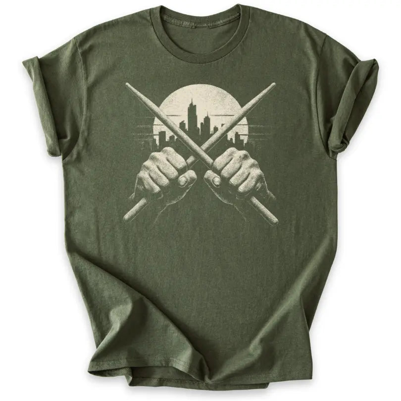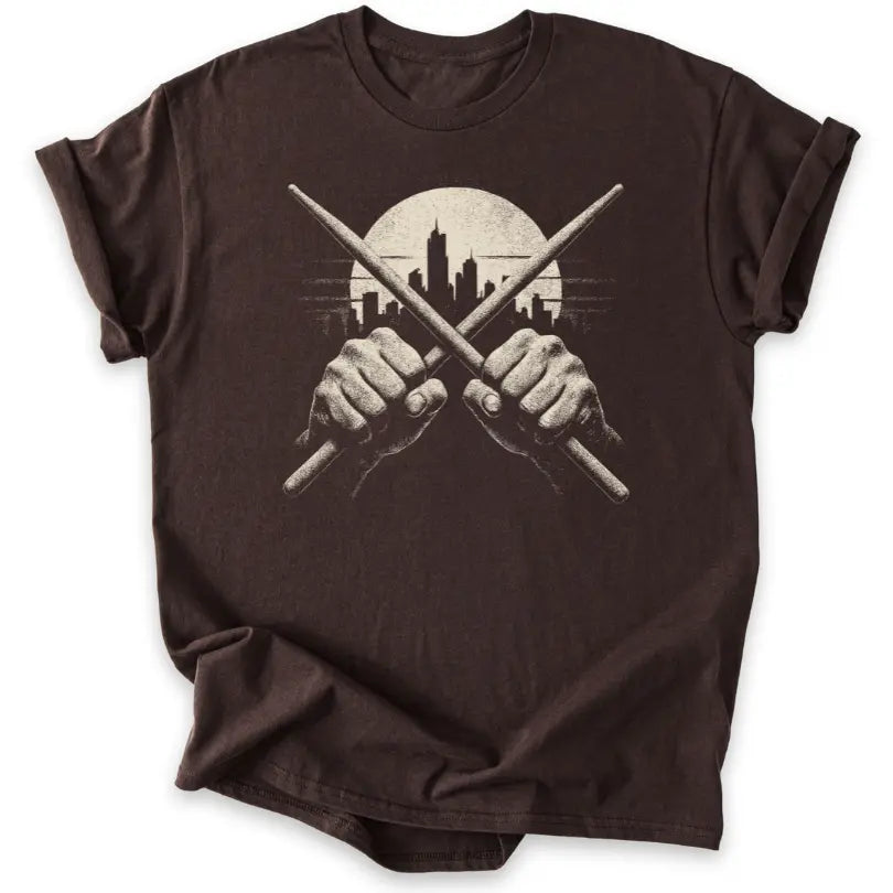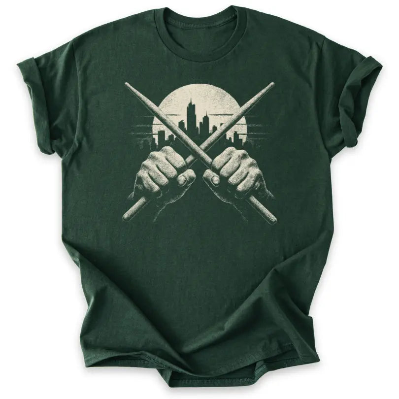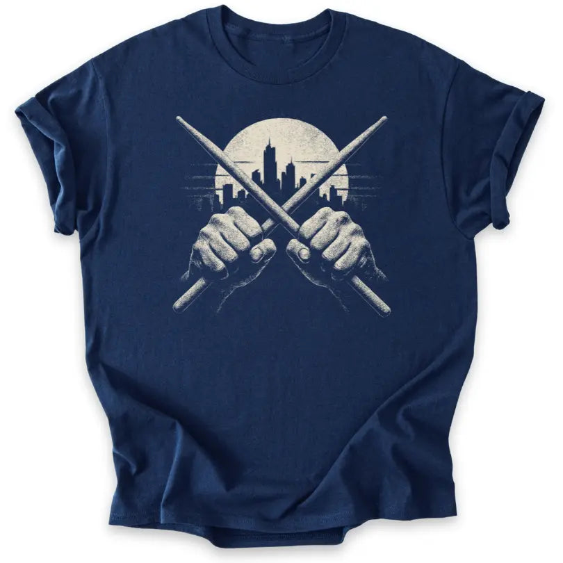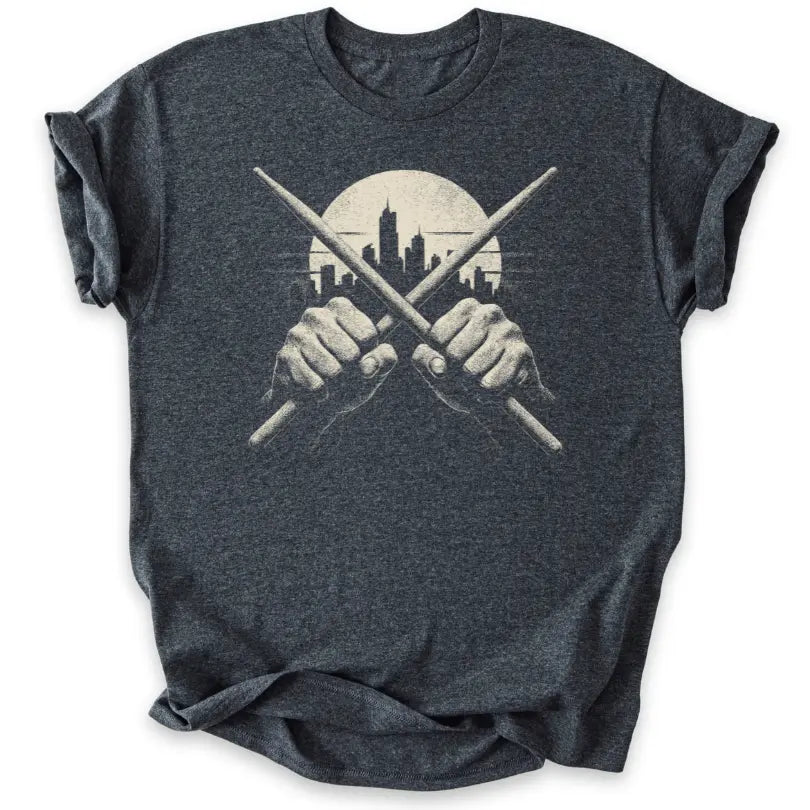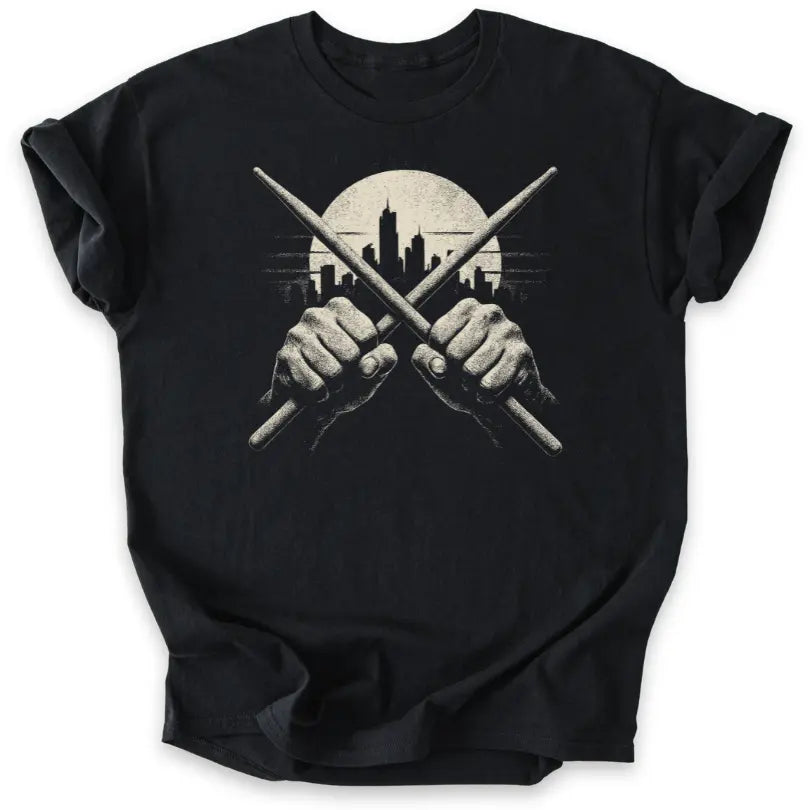 Zwei Sticks, eine Stadt im Takt – dieses Design bringt den urbanen Herzschlag des Drummings auf den Punkt.