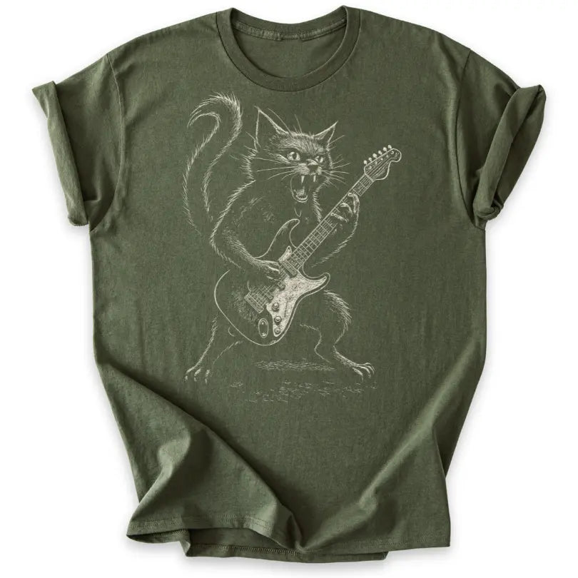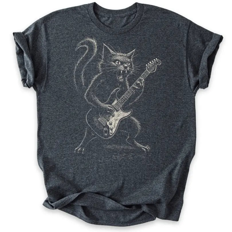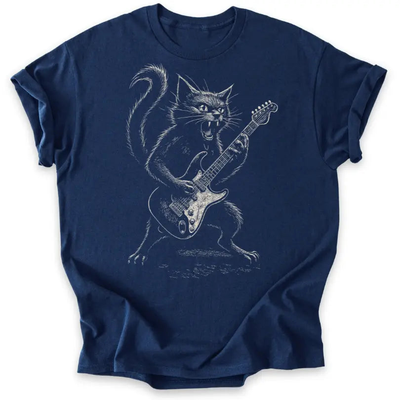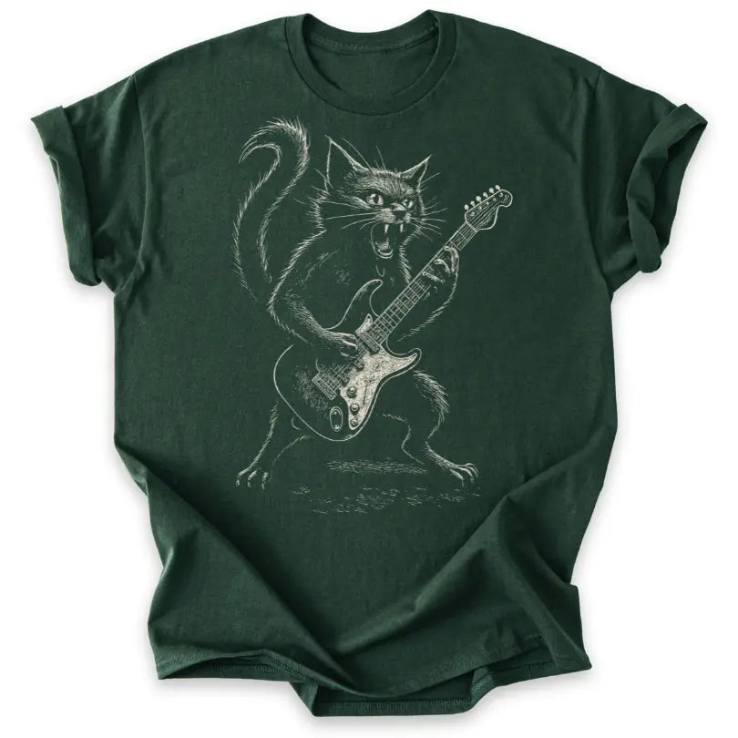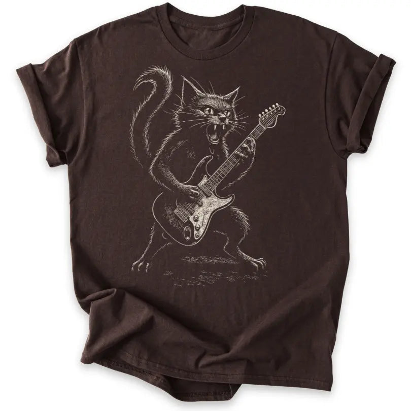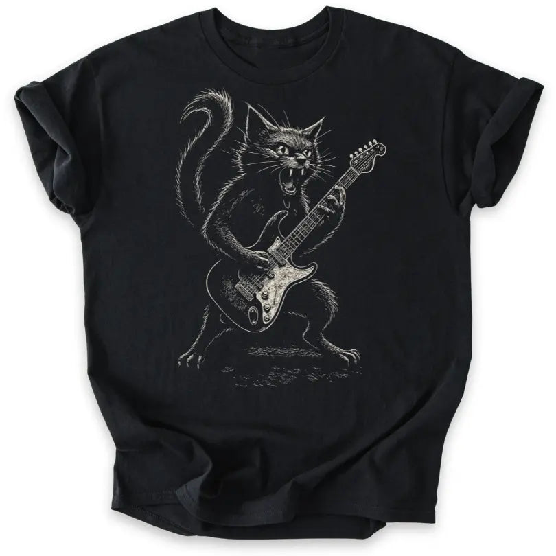 📦 Auch als Geschenk-T-Shirt für Gitarrist:innen, Katzenliebhaber:innen & Rockseelen ideal.