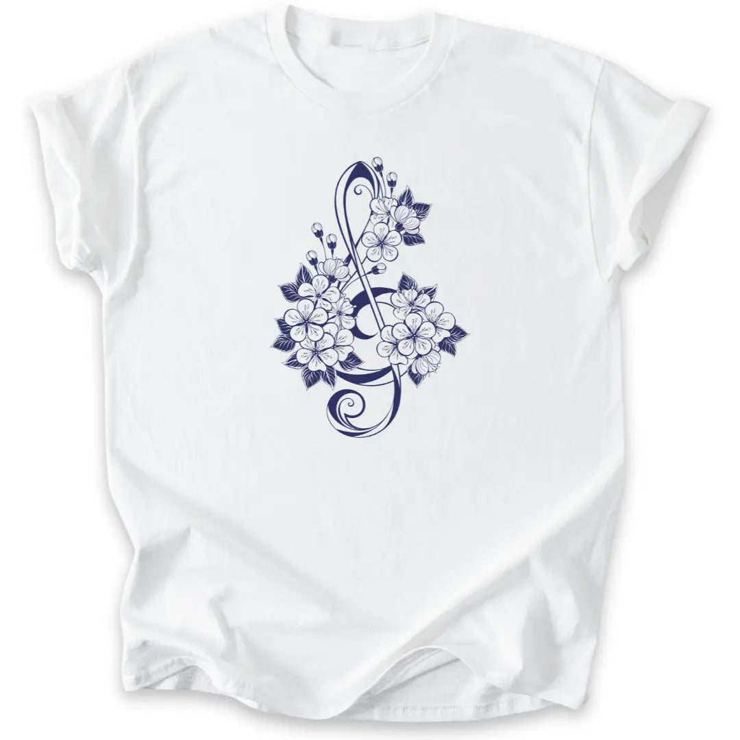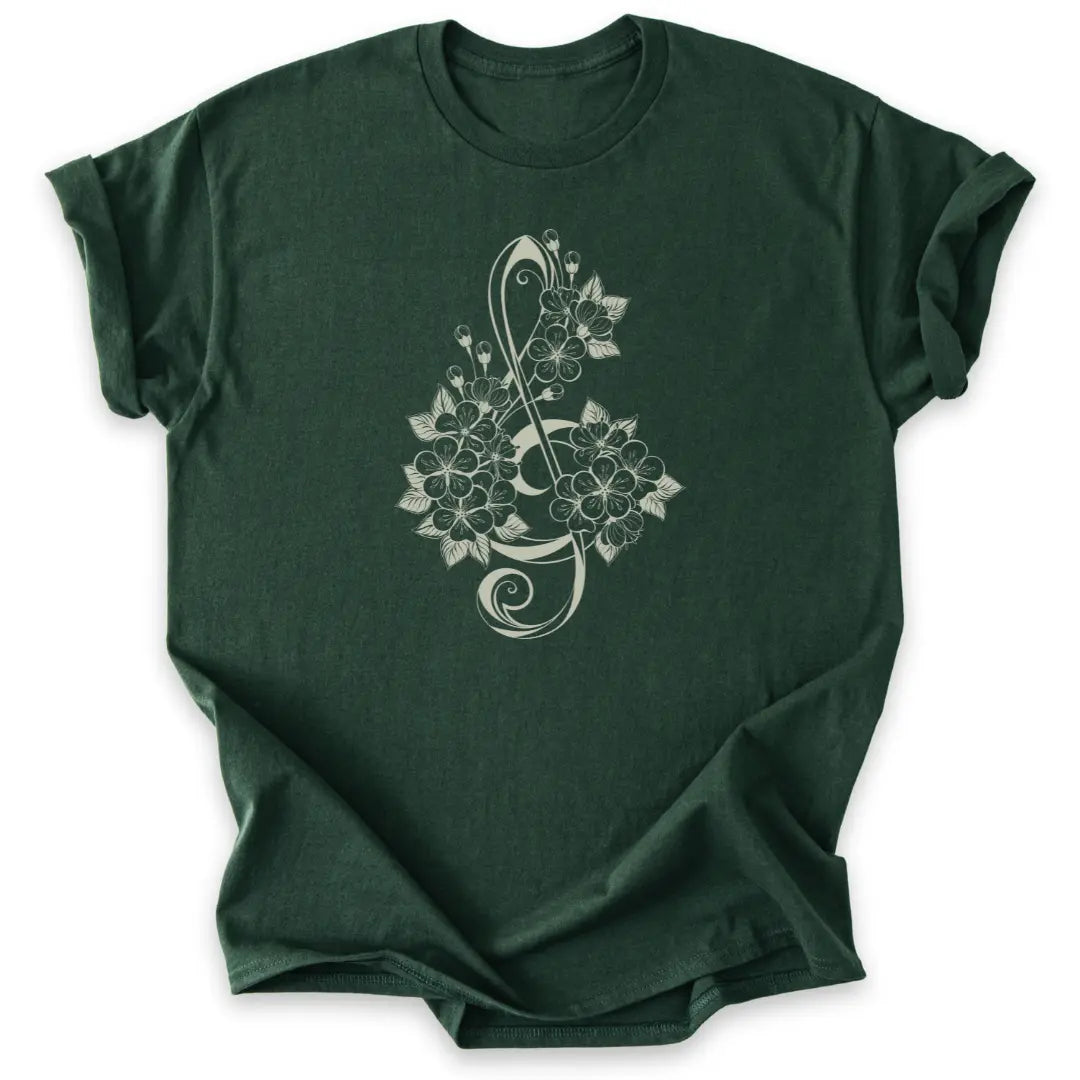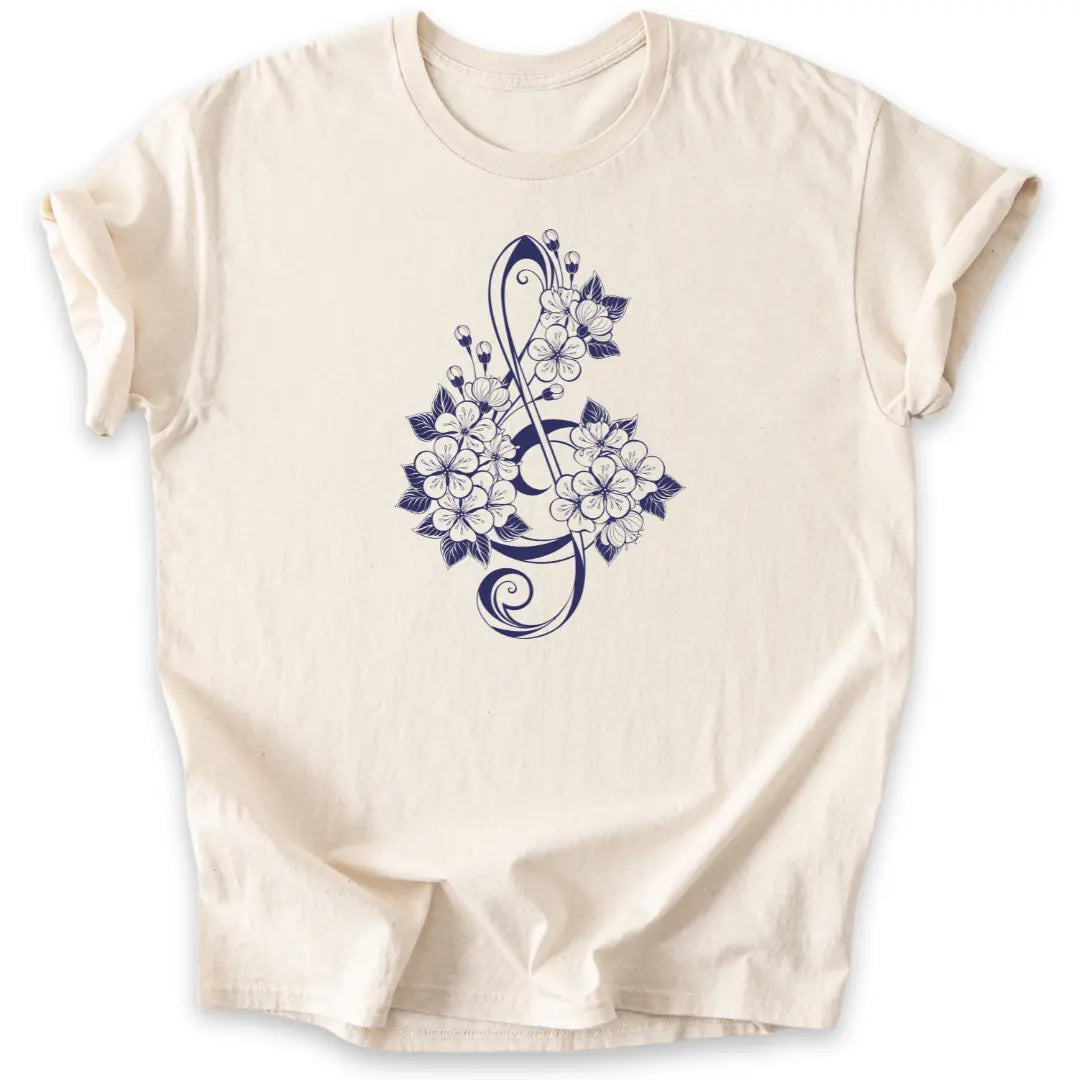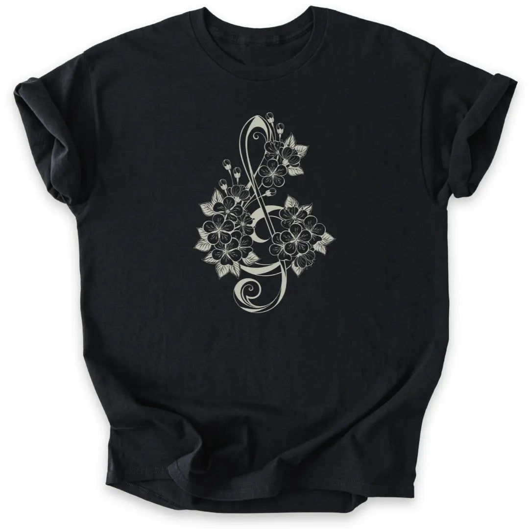 Musik trifft Natur: Dieses T-Shirt verbindet zarte Blüten mit stilvollem Notenschlüssel.
