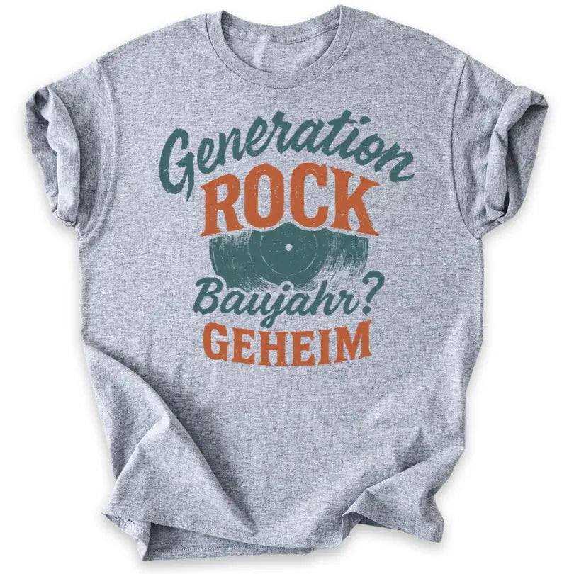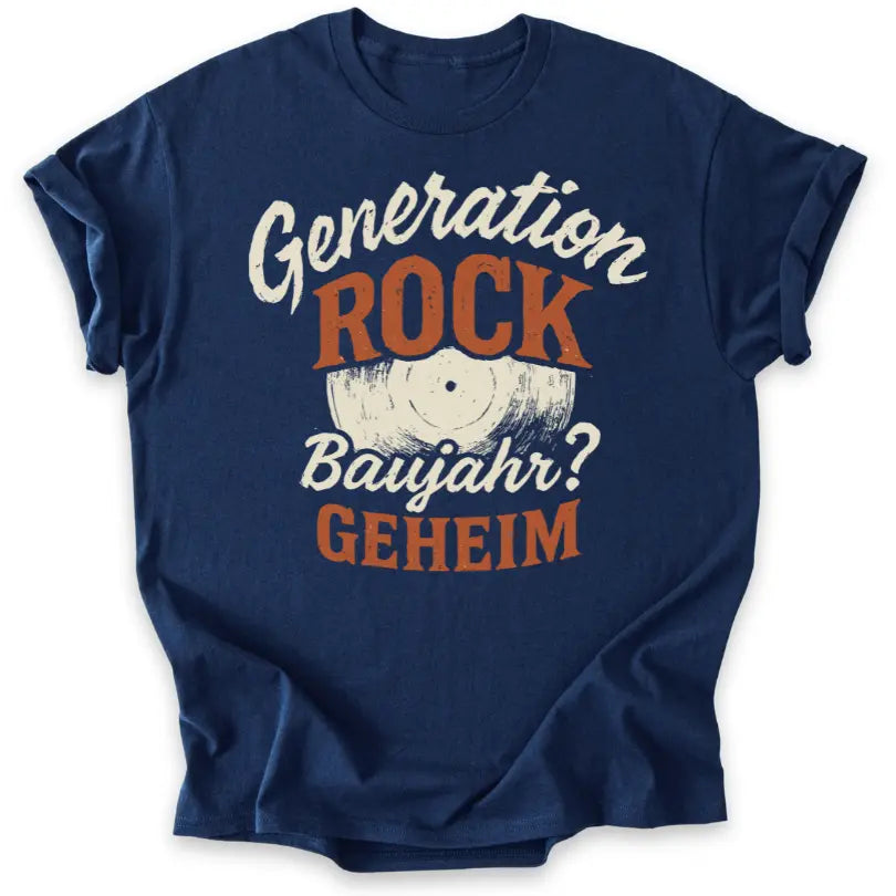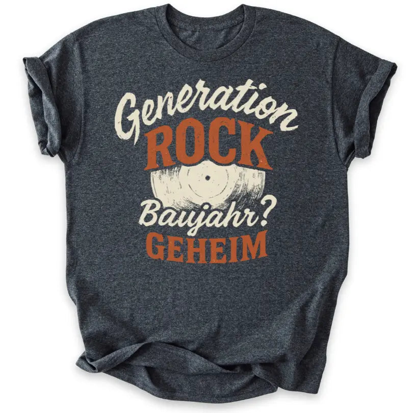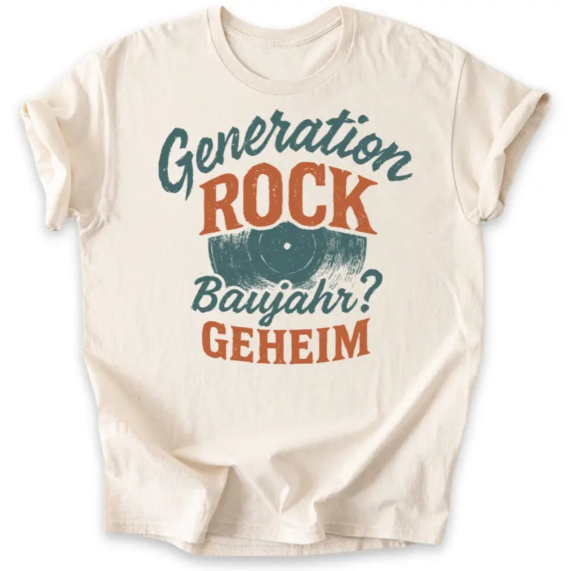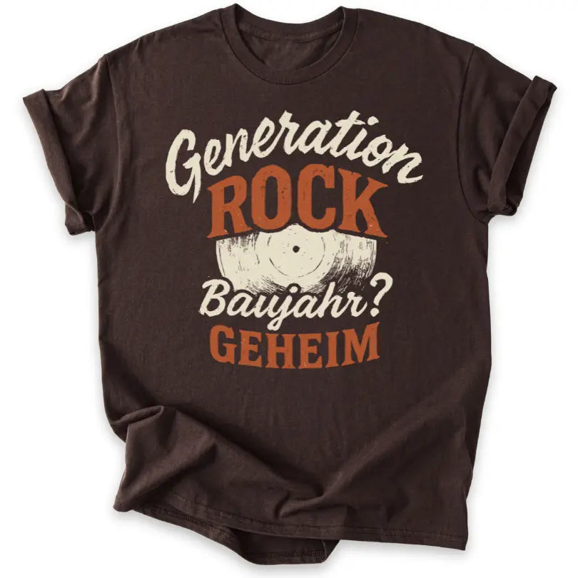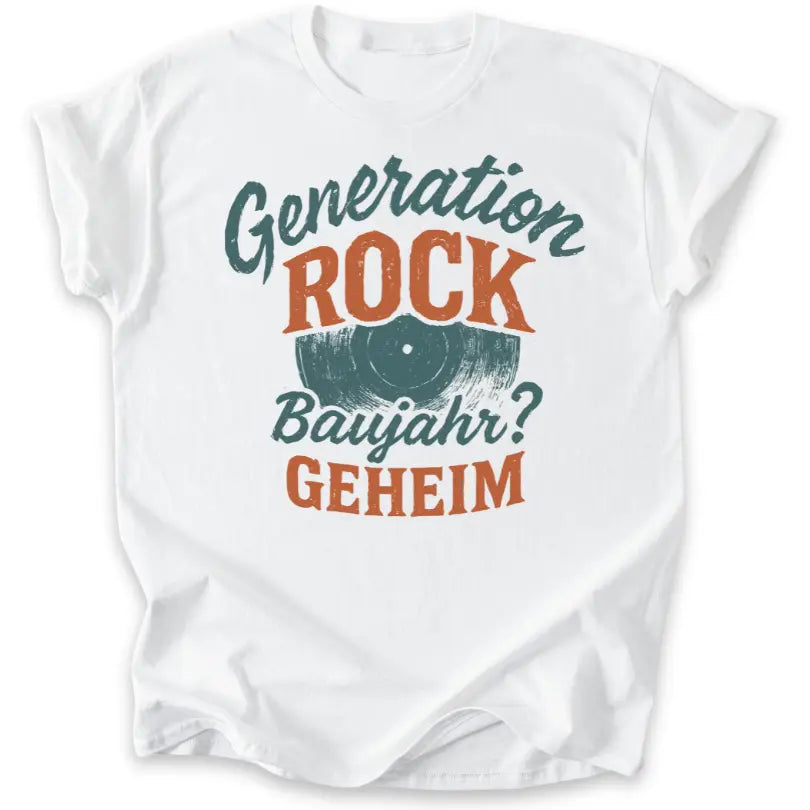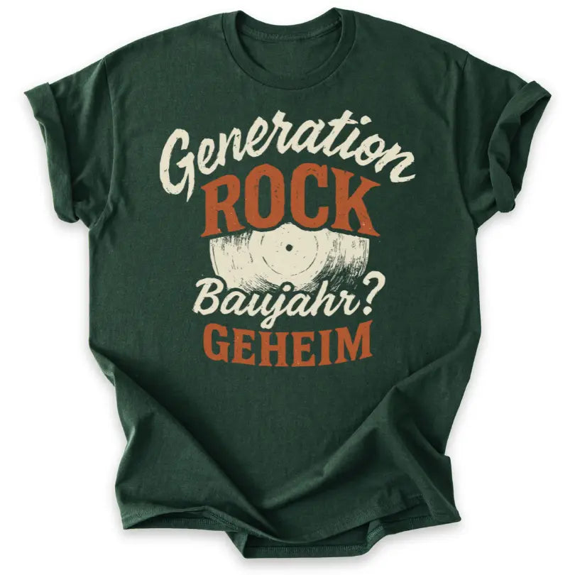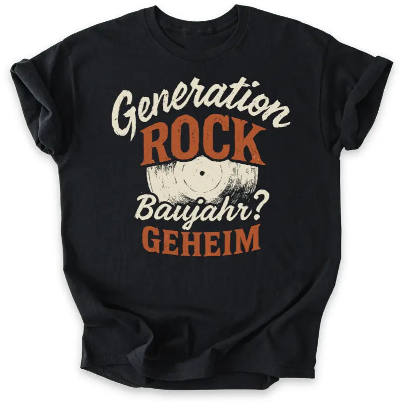 Dieses T-Shirt feiert die „Generation Rock“ mit augenzwinkerndem Spruch und Vinyl-Optik.