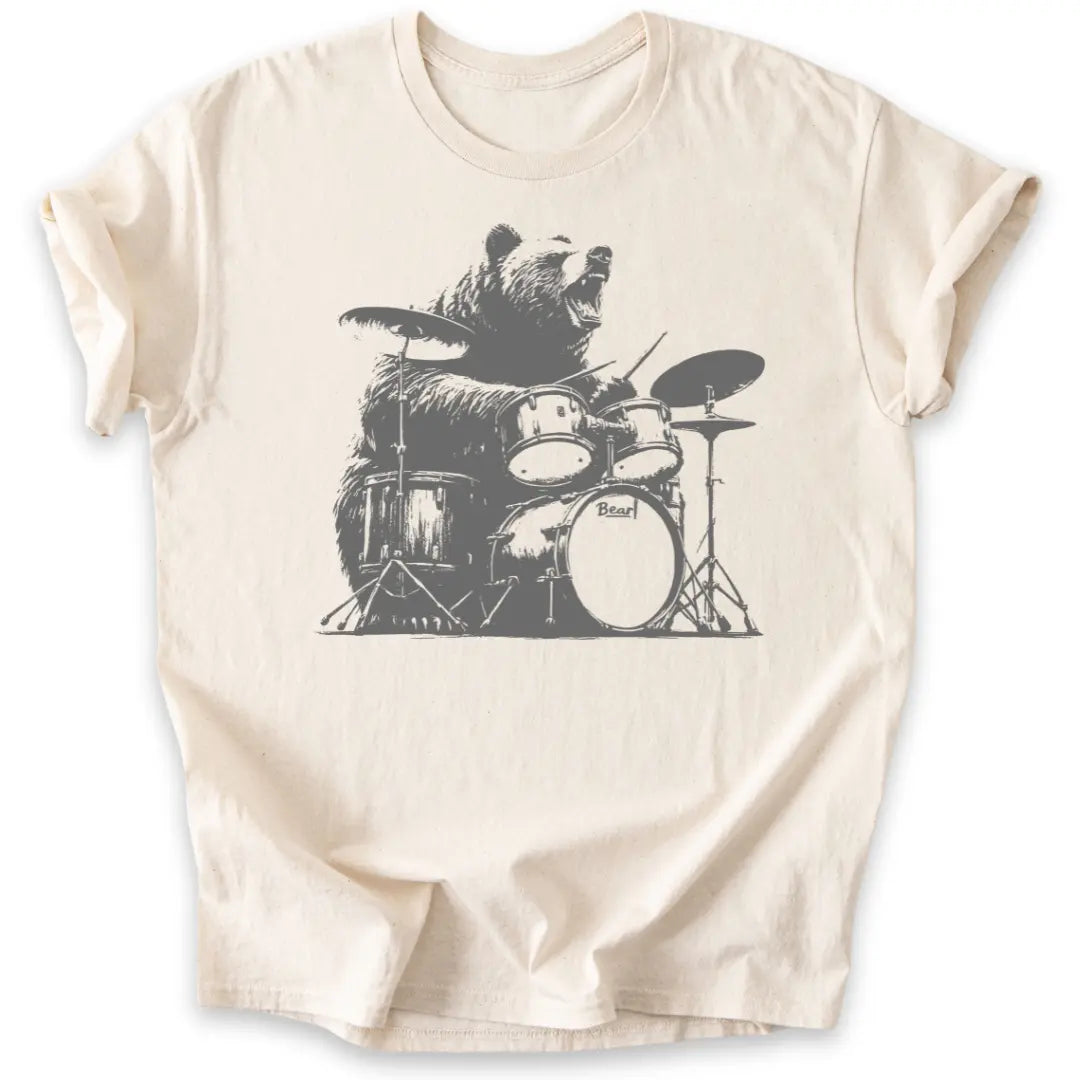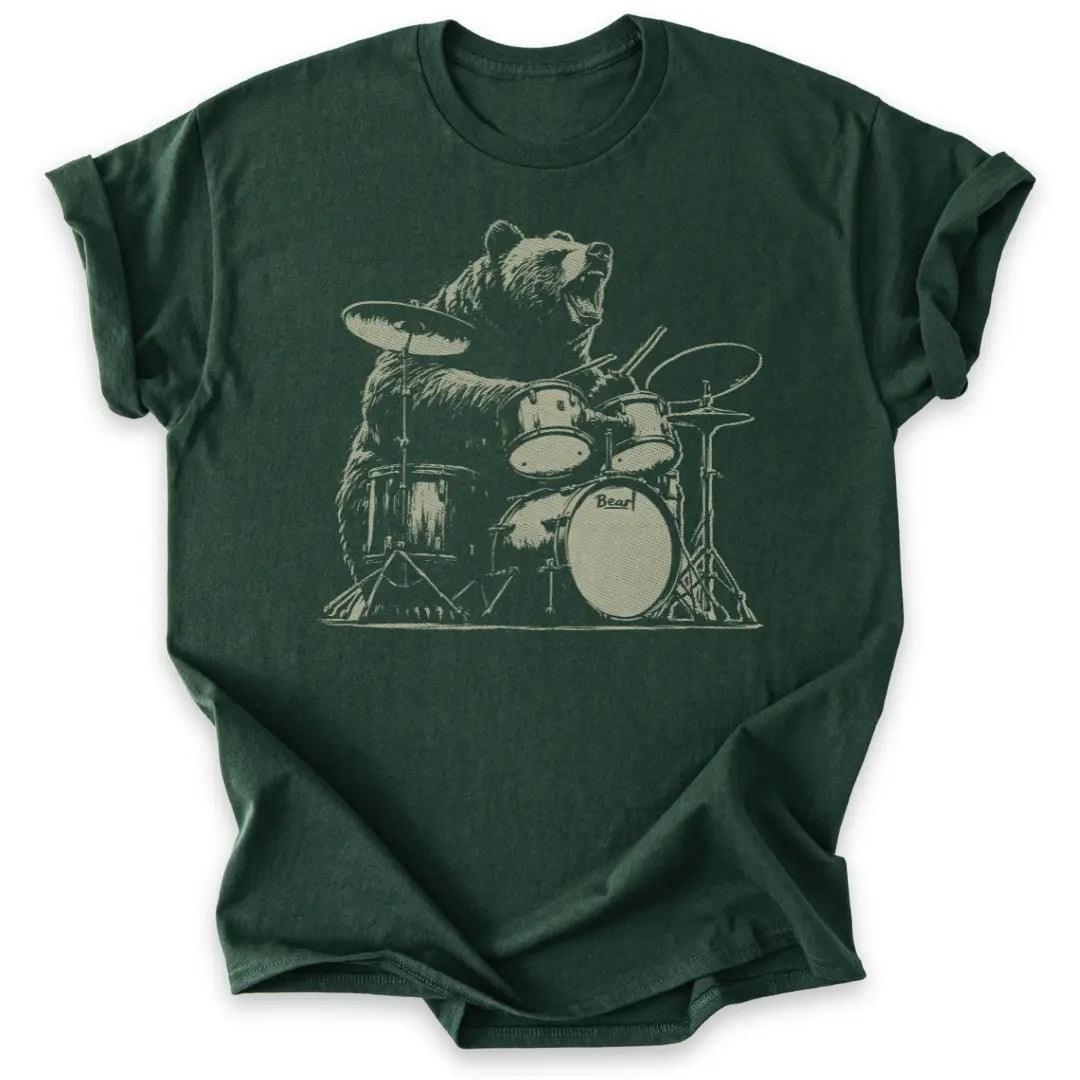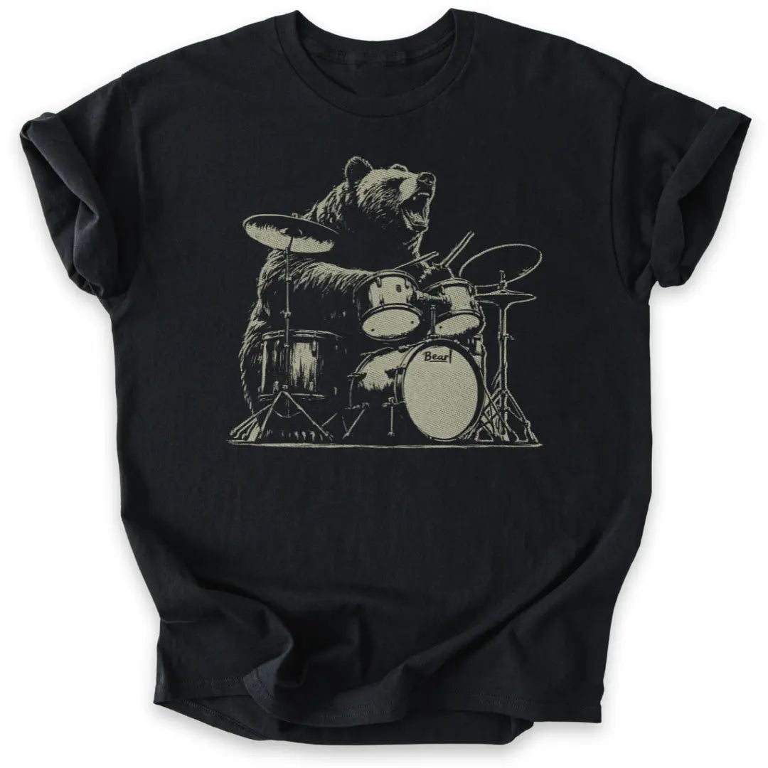 Dieses T-Shirt bringt die rohe Kraft des Rhythmus auf Stoff: ein brüllender Grizzly hinterm Drumset, bereit für den ultimativen Breakdown.