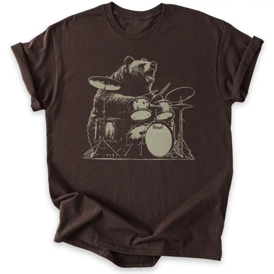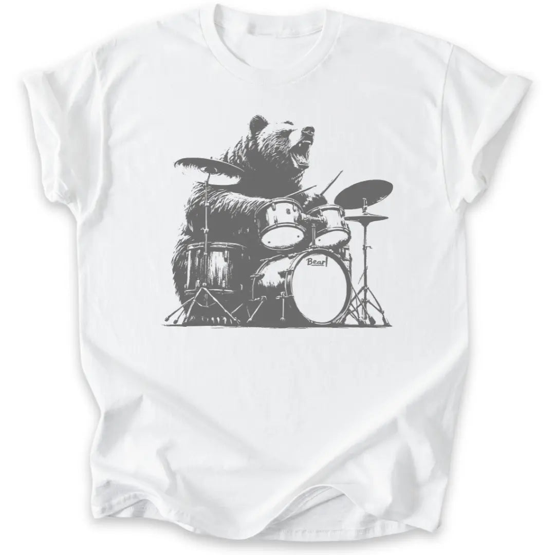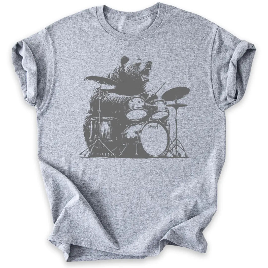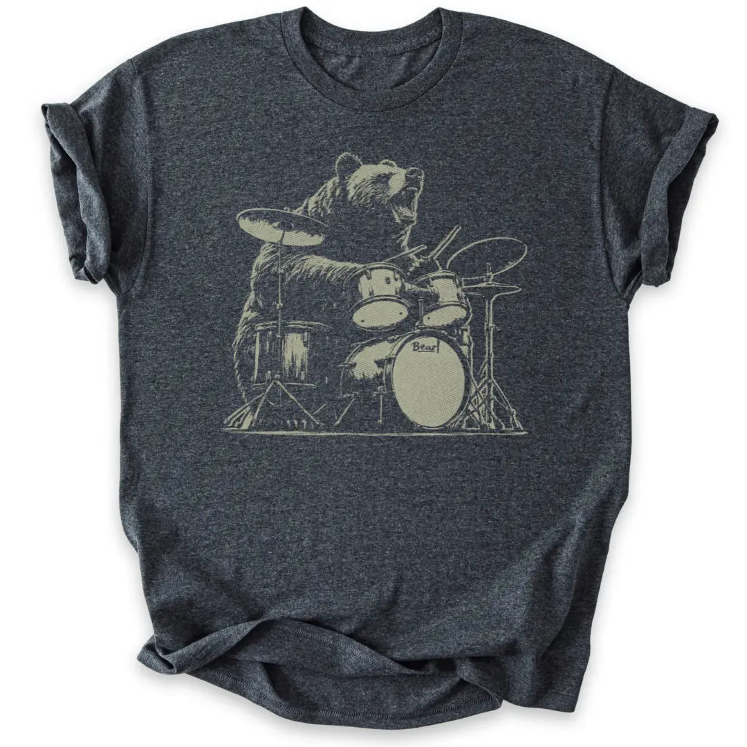 Dieses T-Shirt bringt die rohe Kraft des Rhythmus auf Stoff: ein brüllender Grizzly hinterm Drumset, bereit für den ultimativen Breakdown.