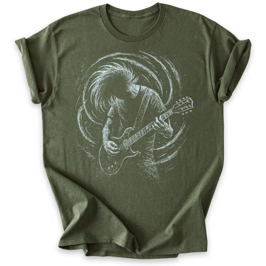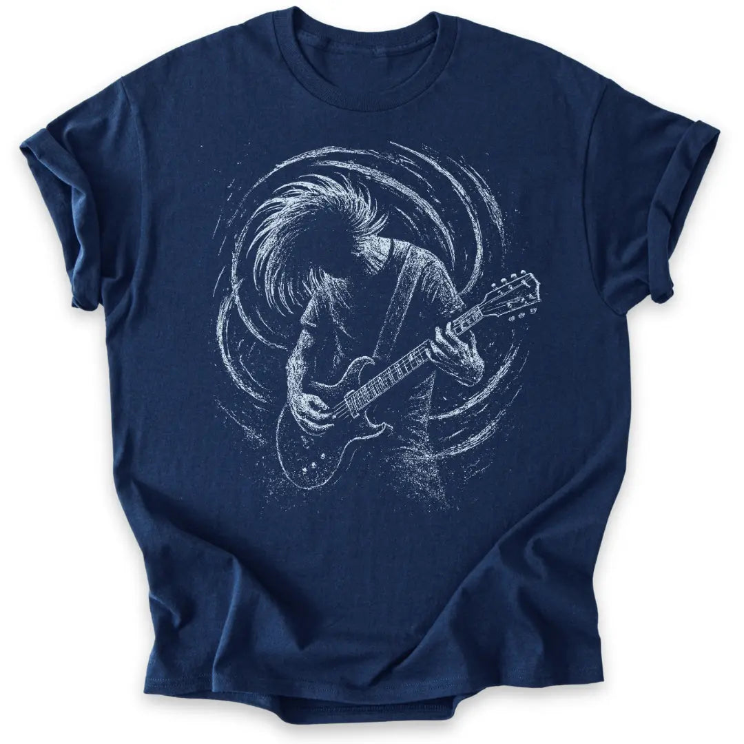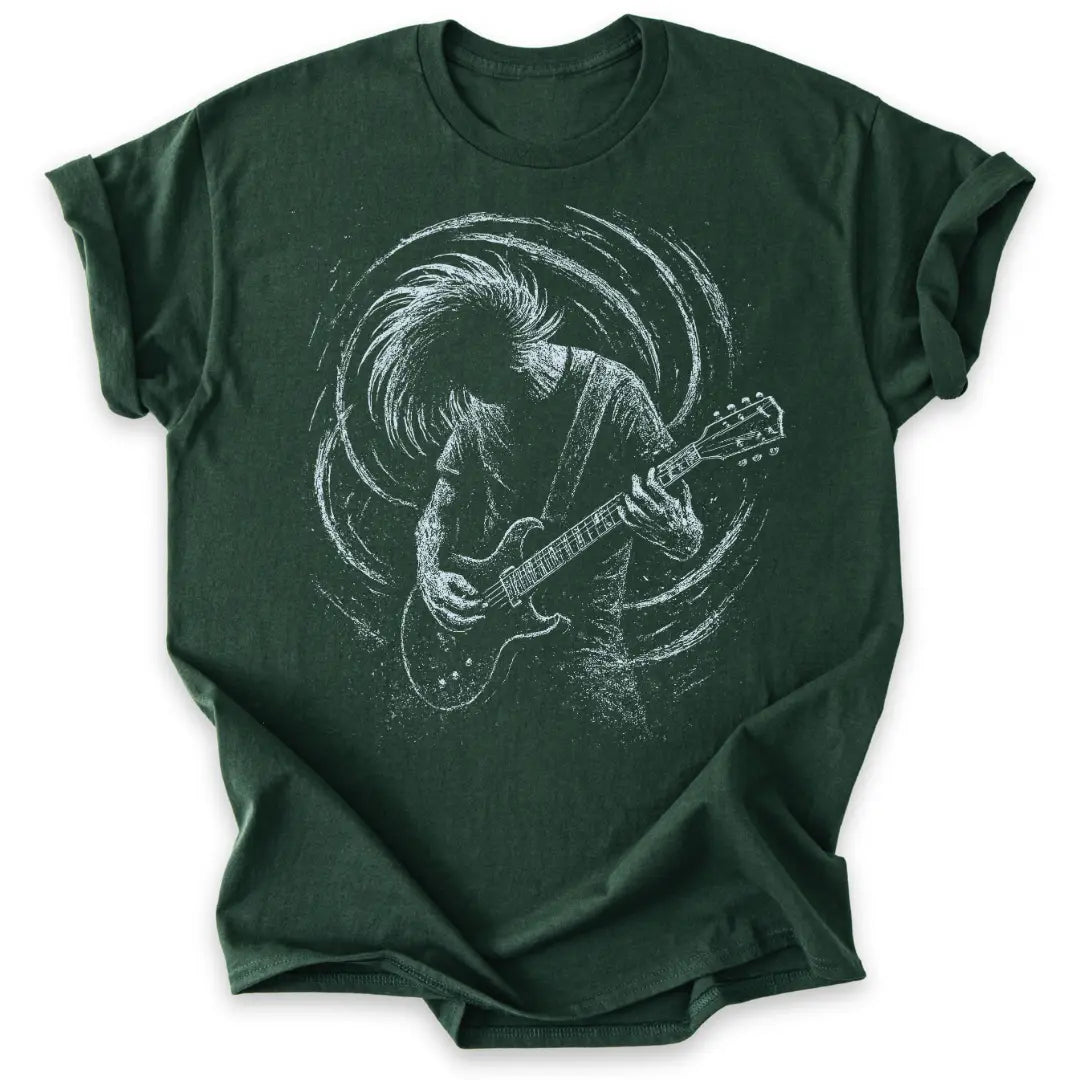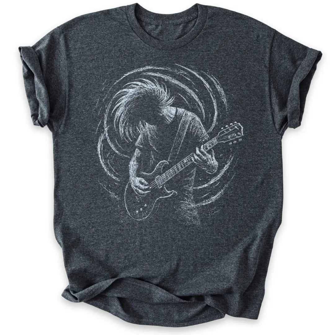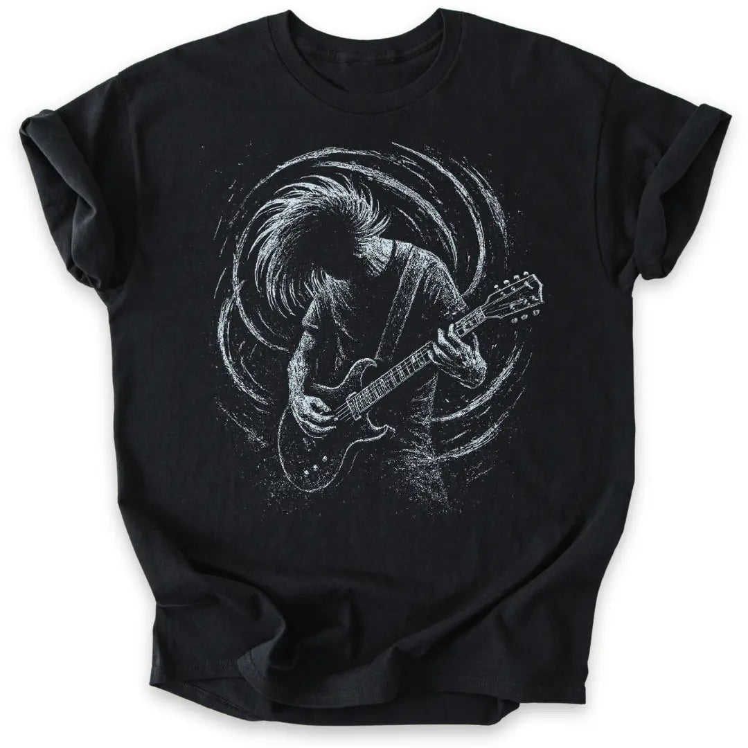 Roh, wild und voller Energie – dieses T-Shirt feiert die Power der Gitarre und den Spirit des Headbangens.