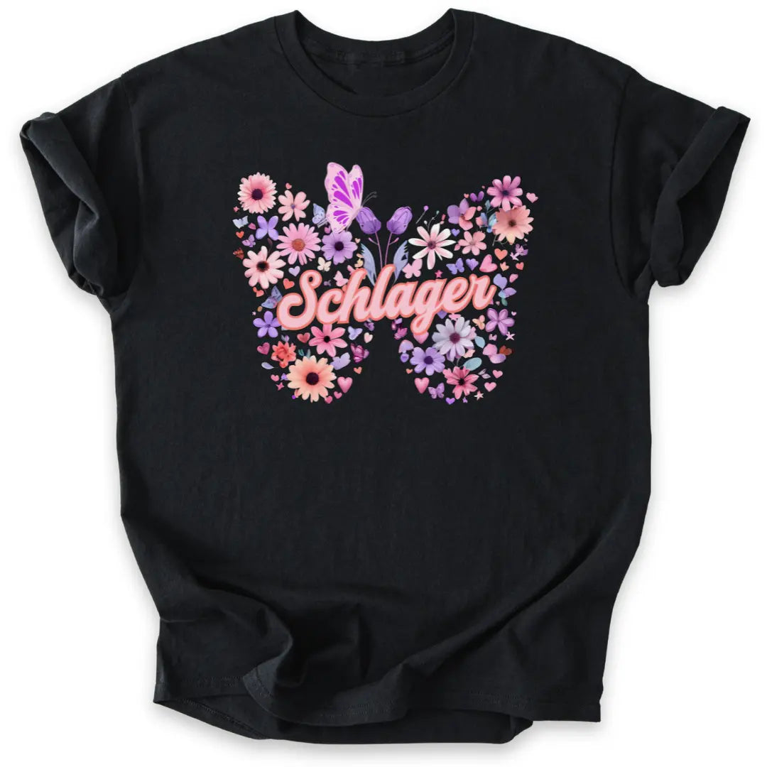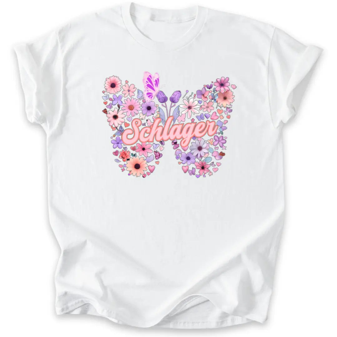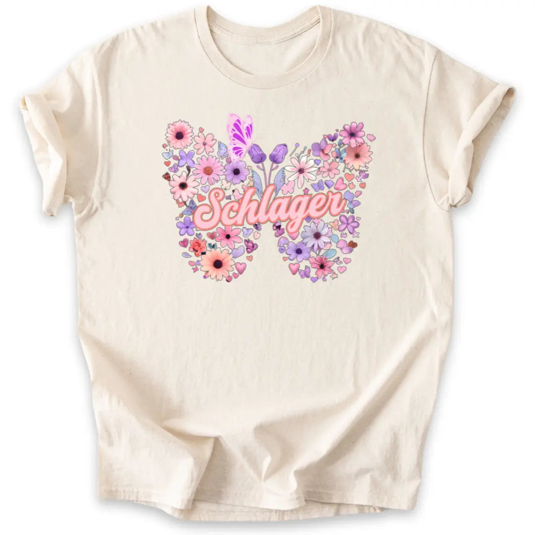Zarte Blumen, flatternde Schmetterlinge und ein sanft geschwungenes „Schlager“ machen dieses Shirt zur perfekten Wahl für echte Schlagerherzen mit Sinn für Stil. Ob Festival, Tanzabend oder einfach für den Alltag – mit diesem Shirt fliegt die Liebe zur Musik immer mit.