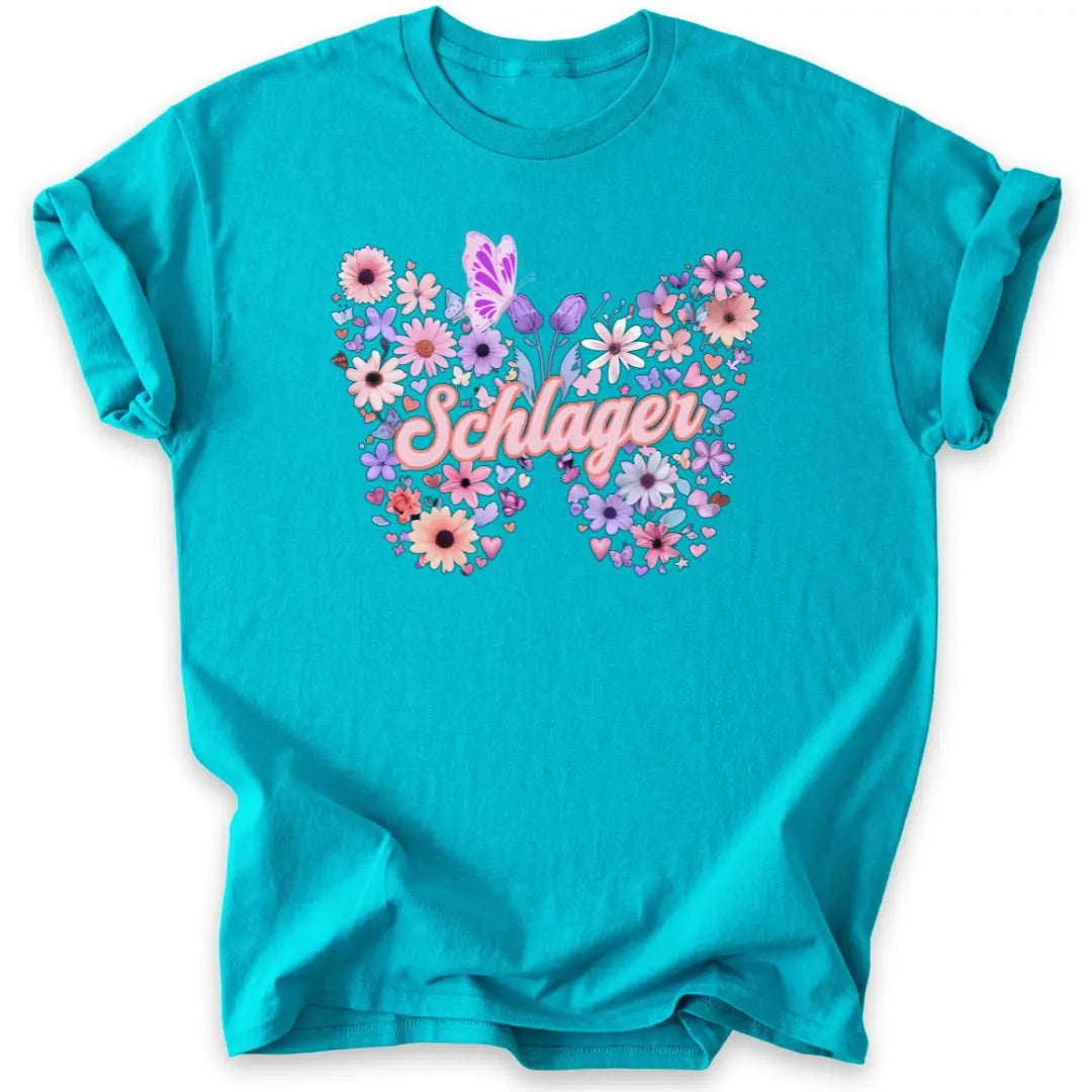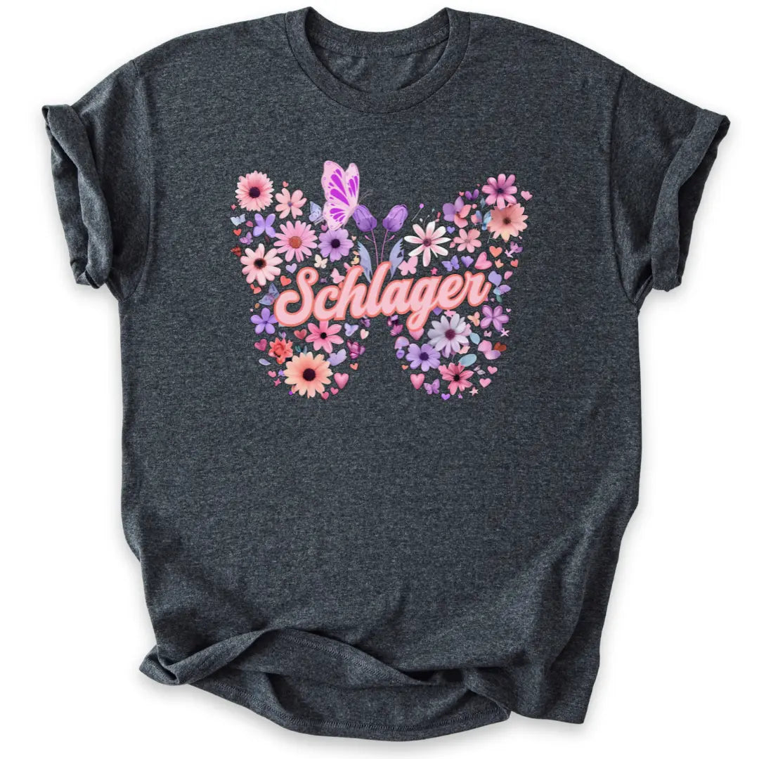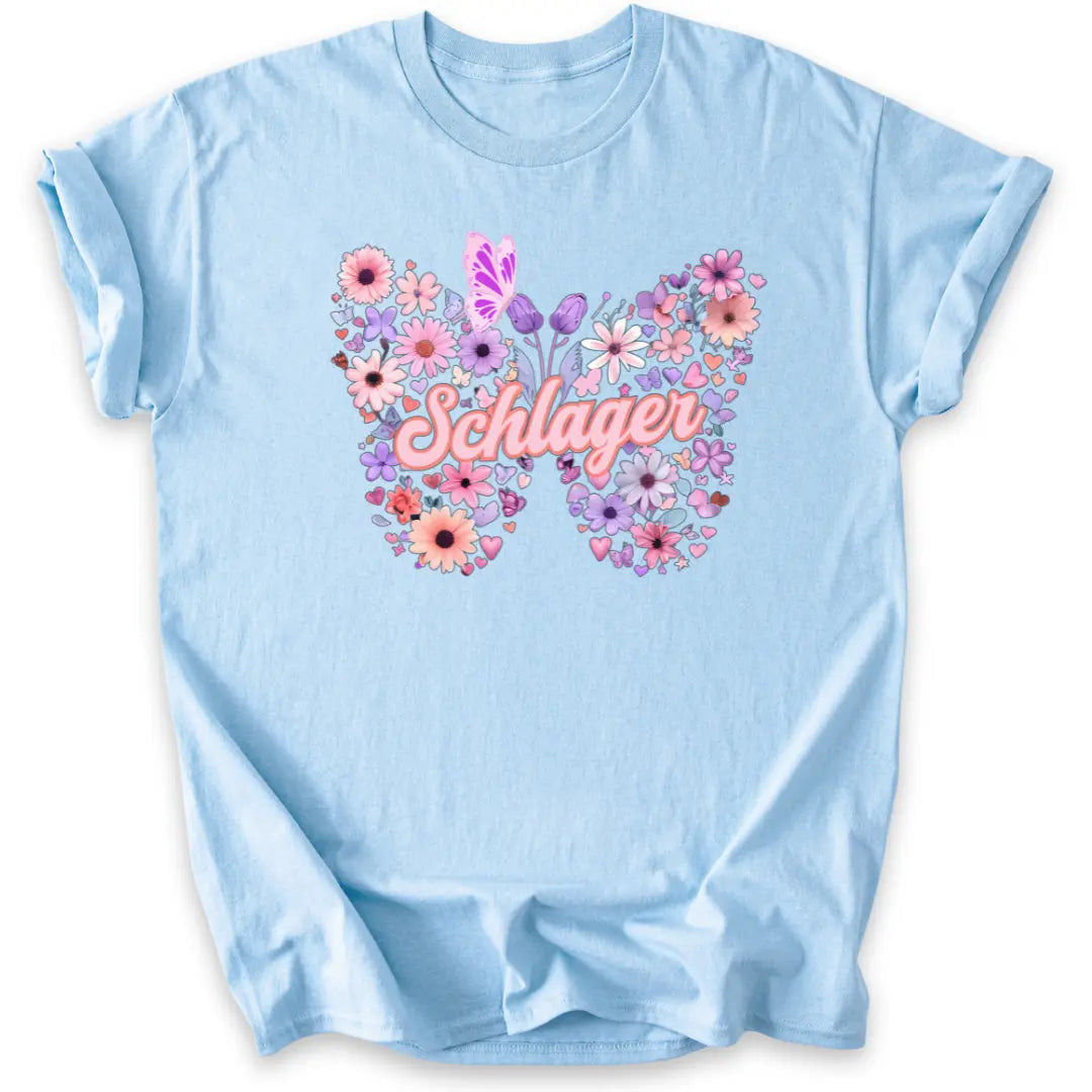 Zarte Blumen, flatternde Schmetterlinge und ein sanft geschwungenes „Schlager“ machen dieses Shirt zur perfekten Wahl für echte Schlagerherzen mit Sinn für Stil. Ob Festival, Tanzabend oder einfach für den Alltag – mit diesem Shirt fliegt die Liebe zur Musik immer mit.