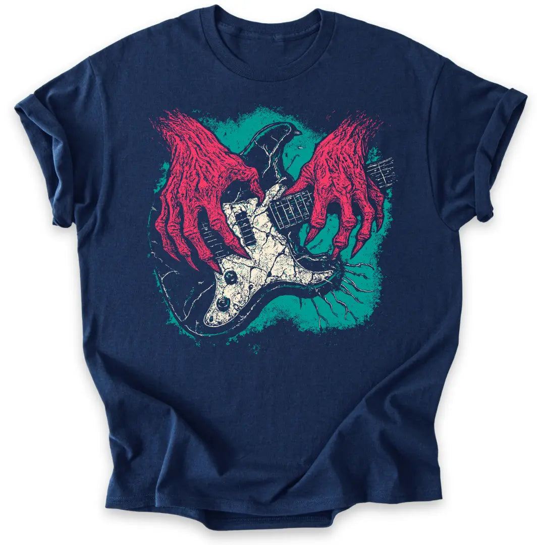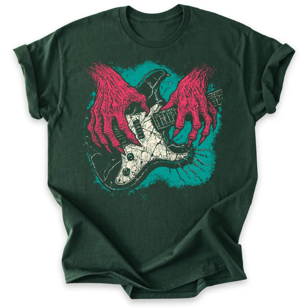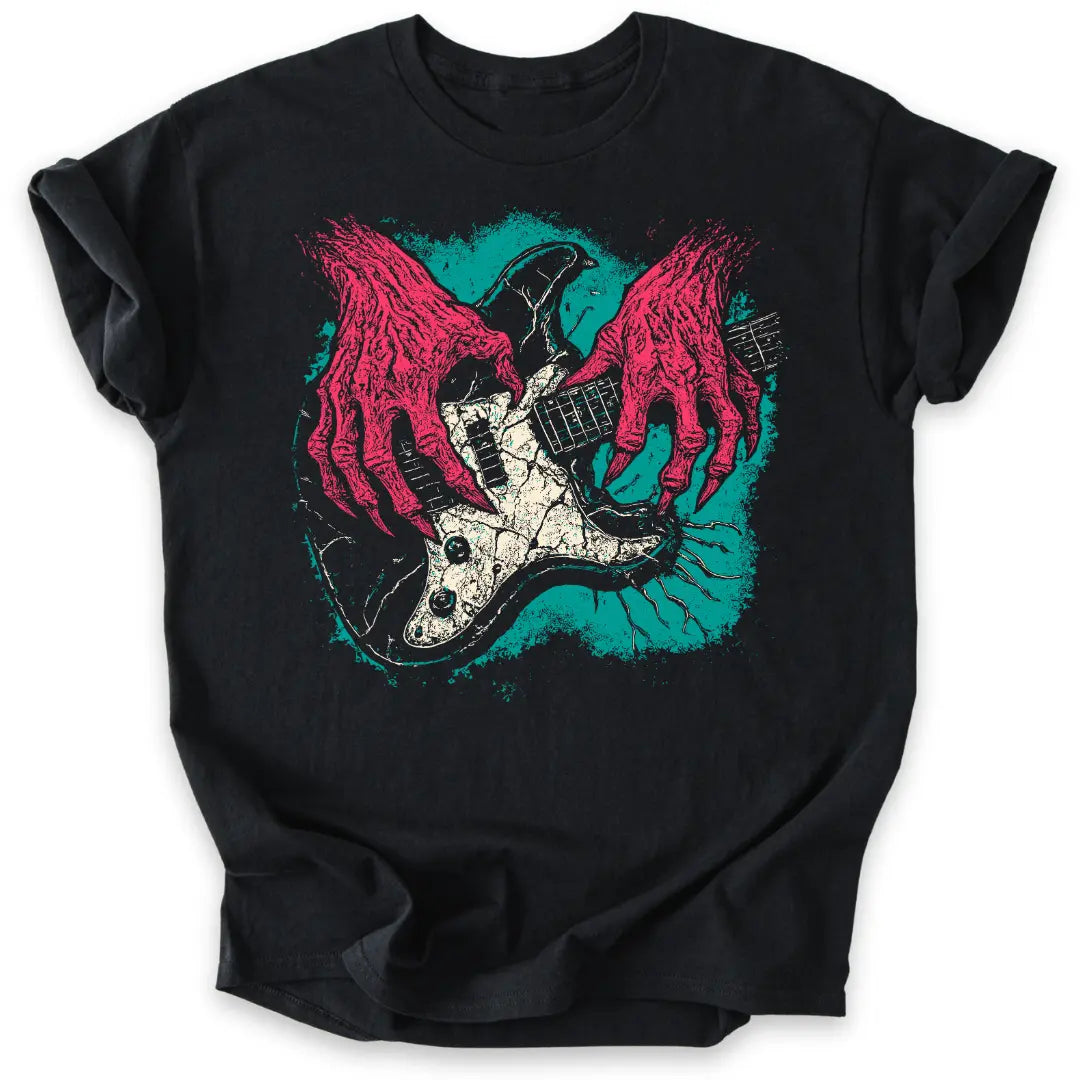Wenn untote Hände zur Gitarre greifen, wird der Sound unsterblich – dieses T-Shirt ist purer Rock-Horror mit Kultfaktor.