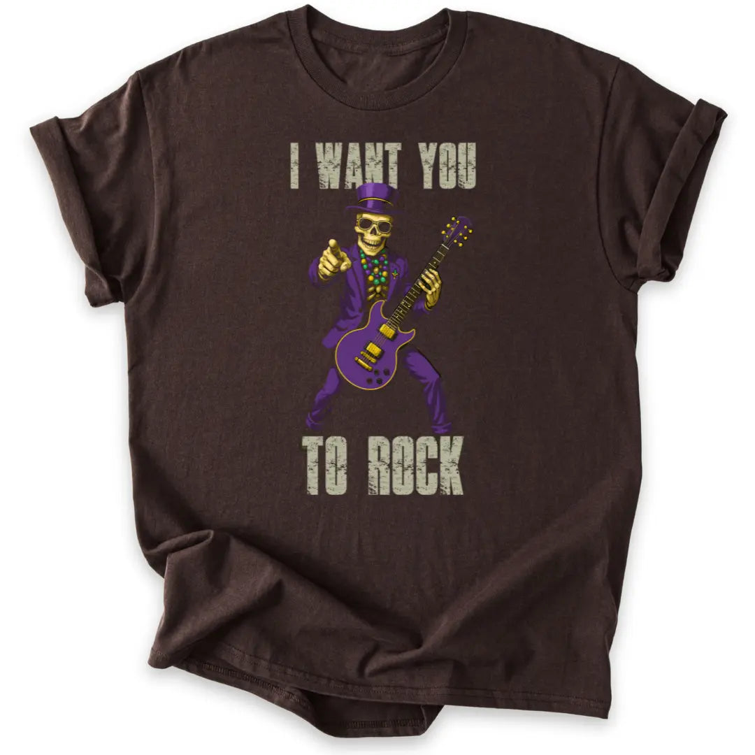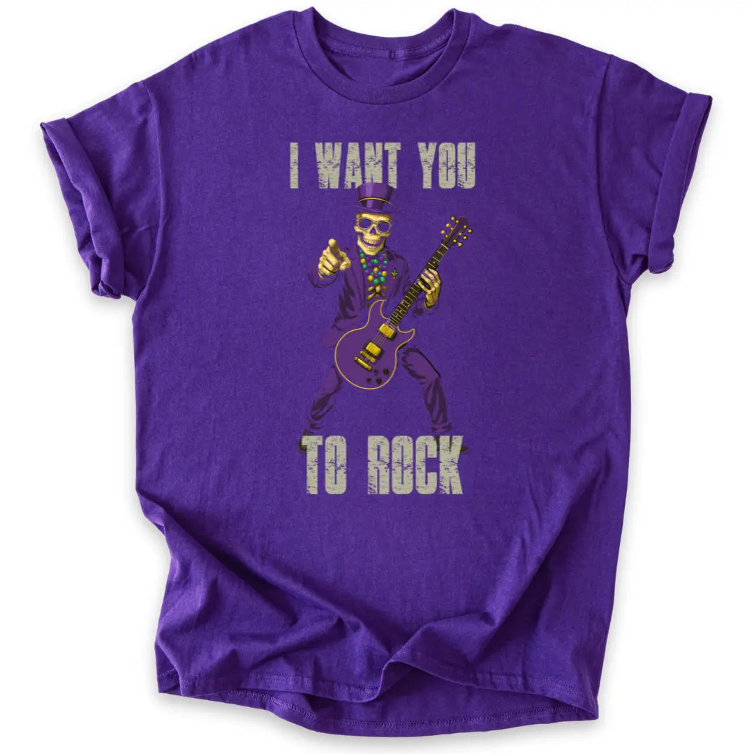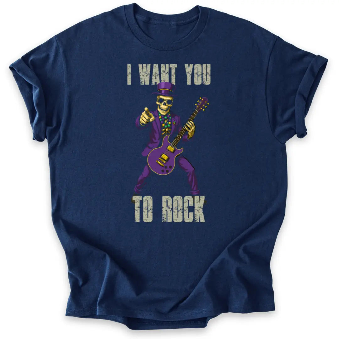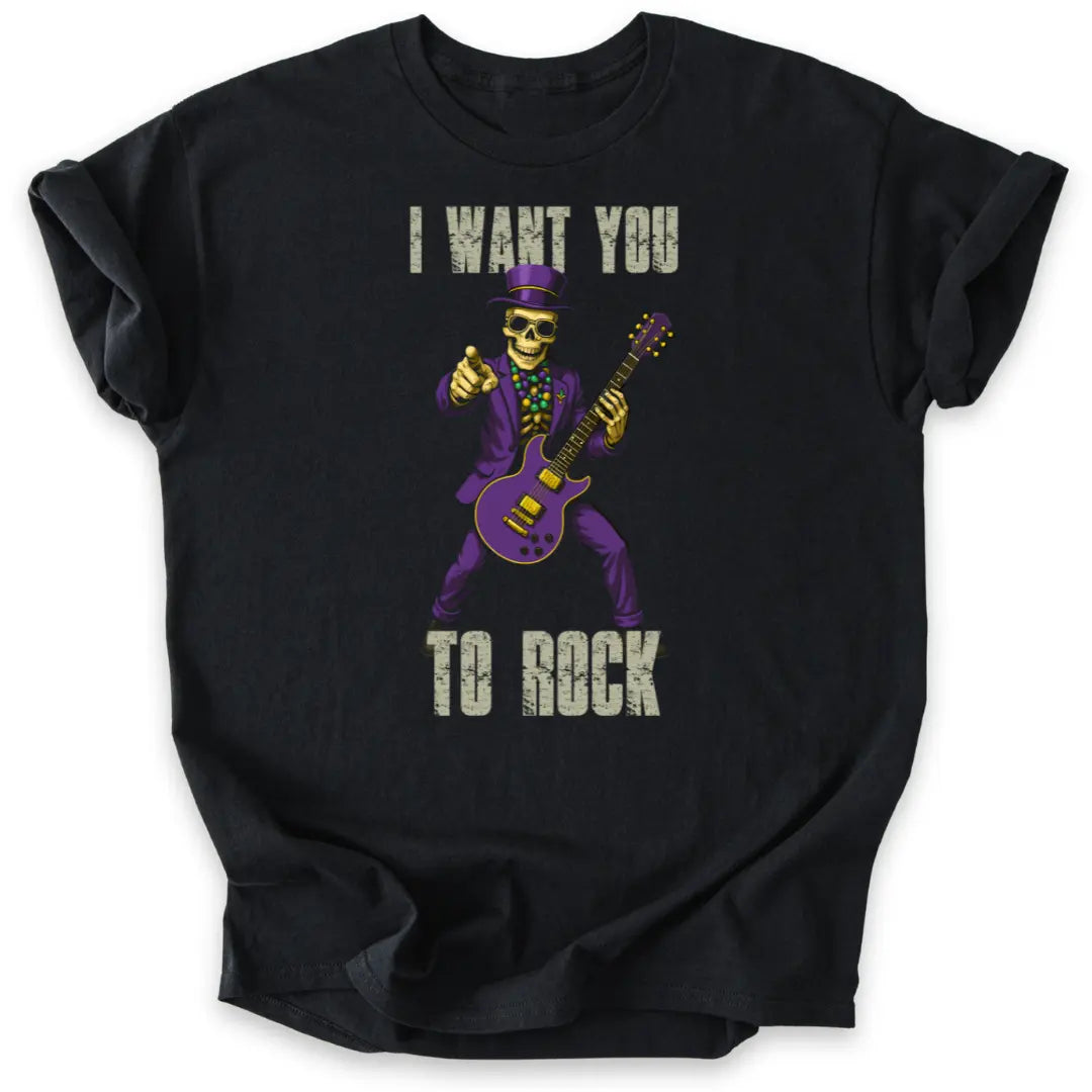 Dieses Shirt bringt dir einen Skelett-Gitarristen in Anzug und Zylinder, der nicht fragt, sondern fordert: „I want you to rock!“