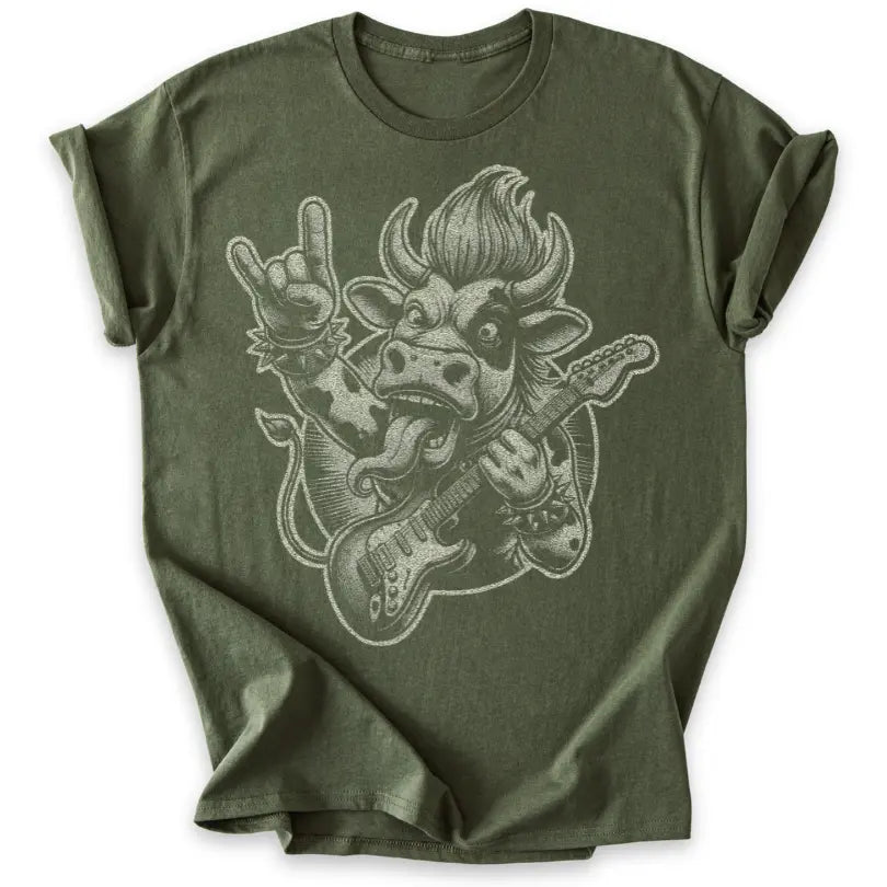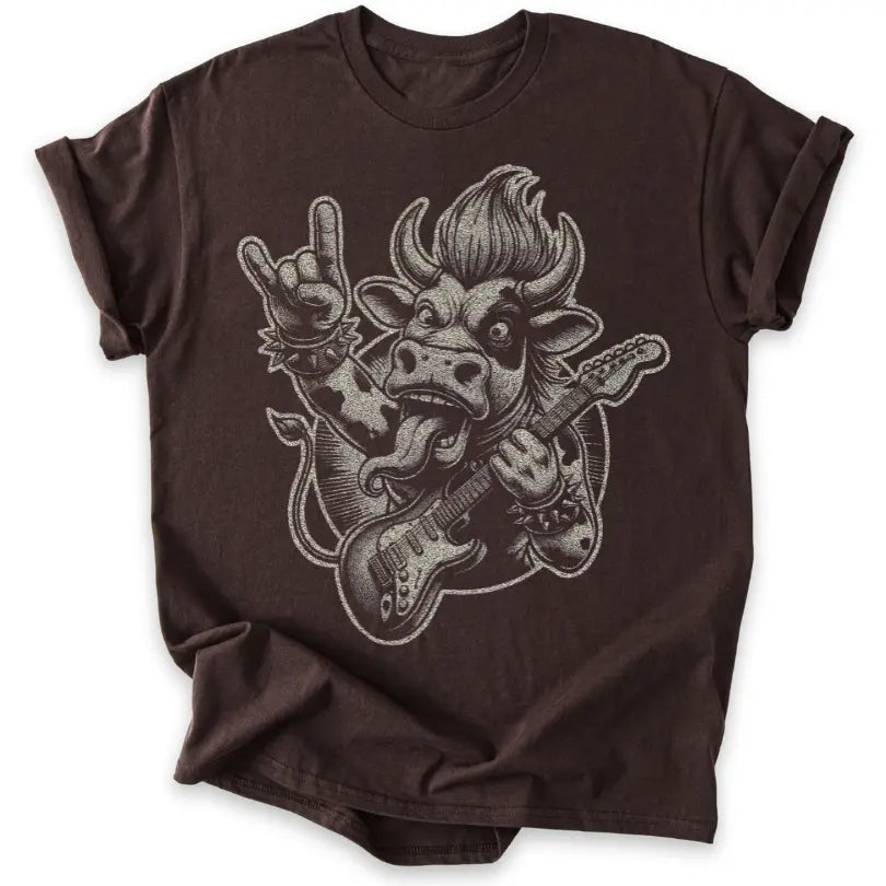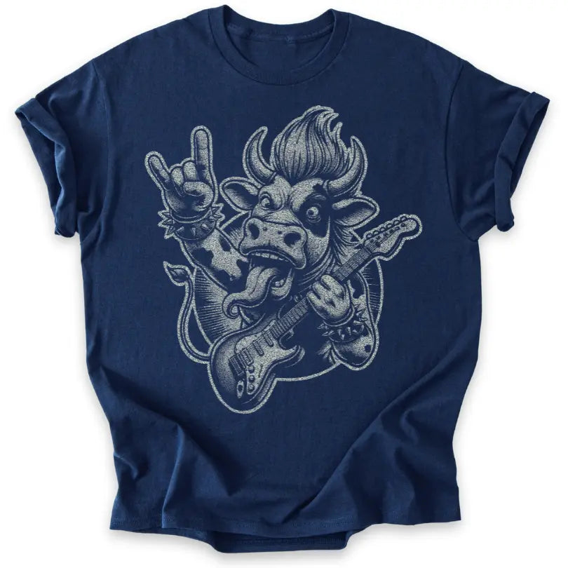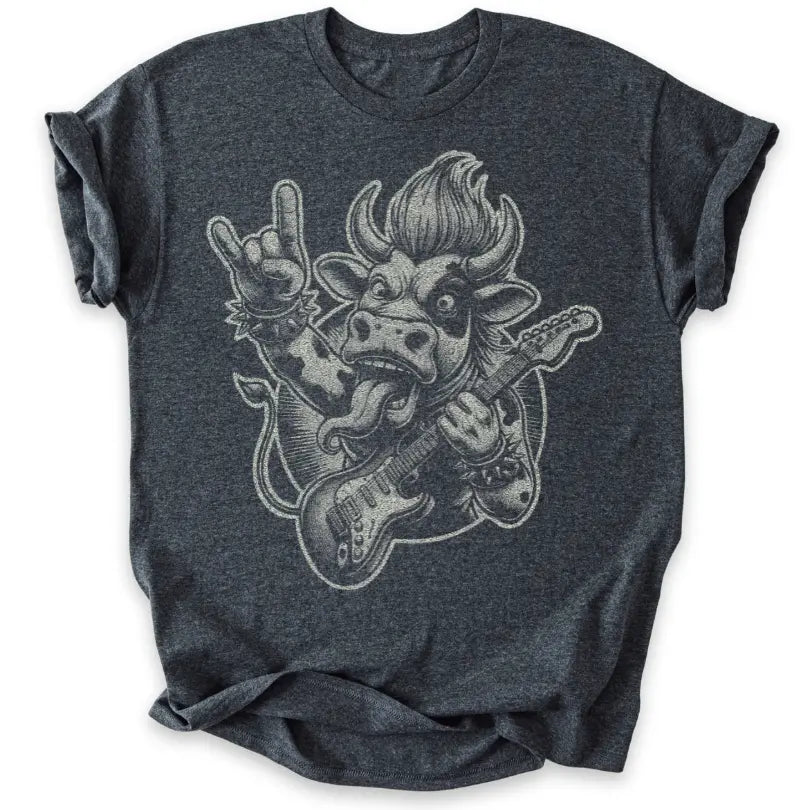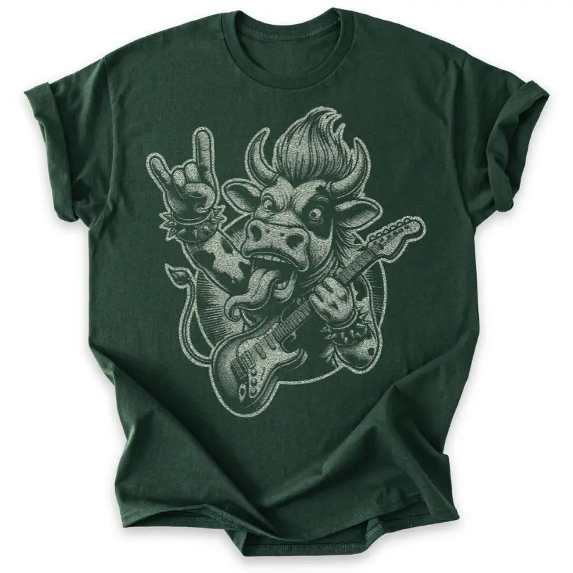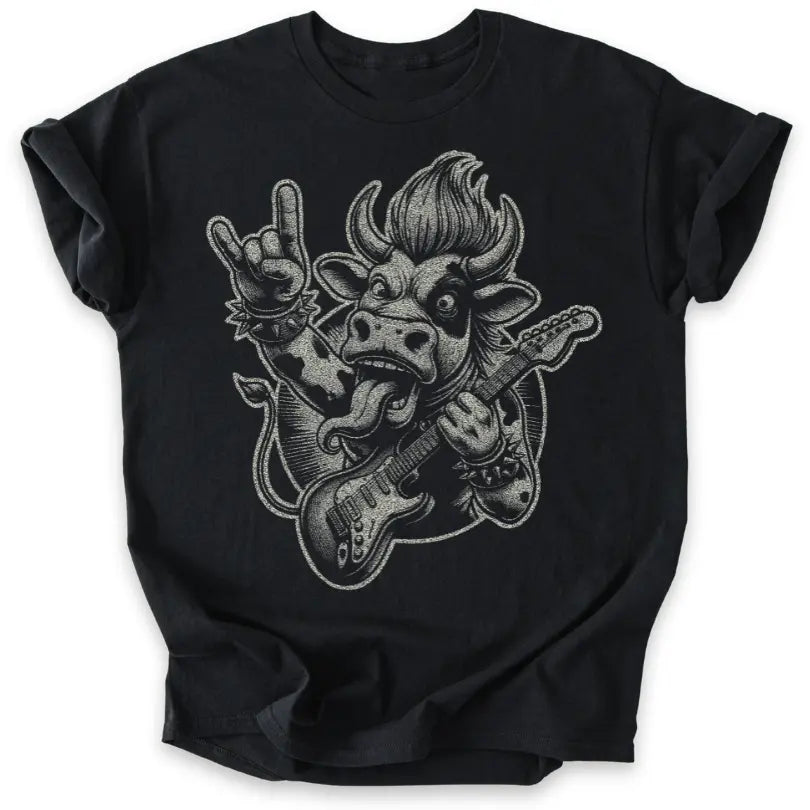 Eine Kuh mit Gitarre, Irokesenfrisur und Rockhand – lauter wird’s nicht!