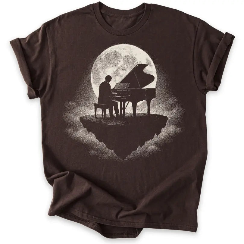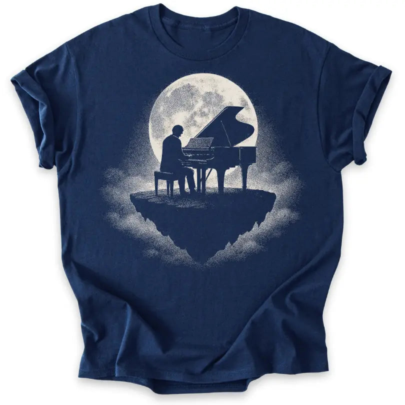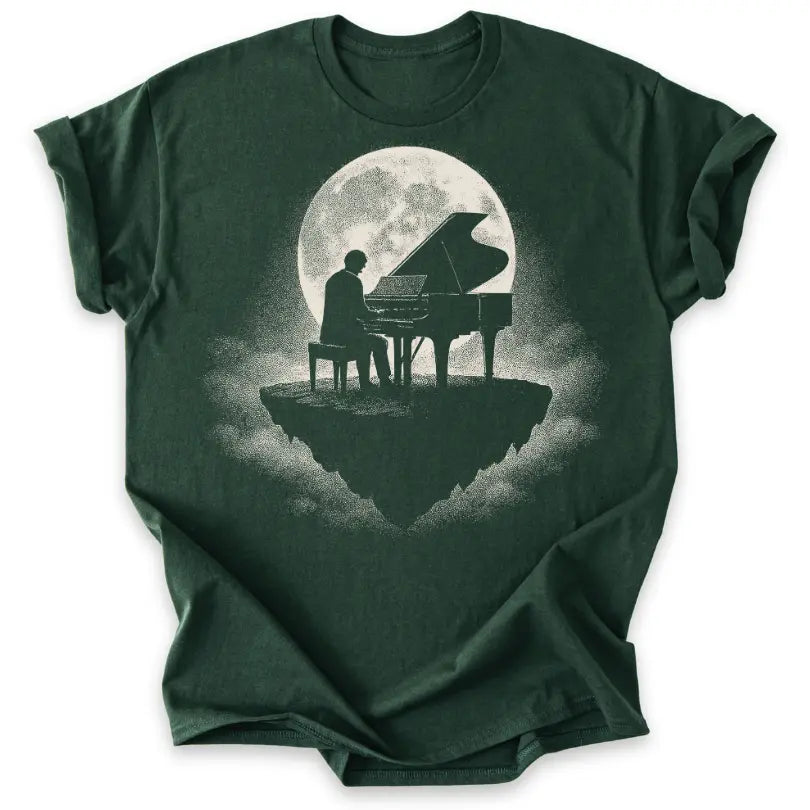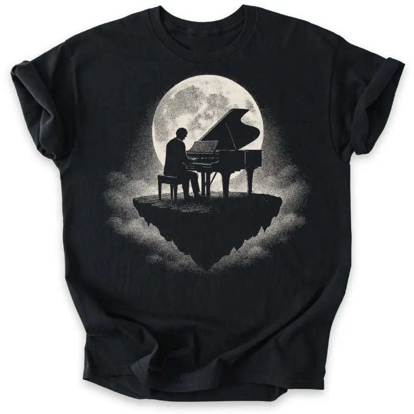 Ein Pianist zwischen Himmel und Erde – dieses T-Shirt fängt die Magie von Musik und Mondlicht ein.