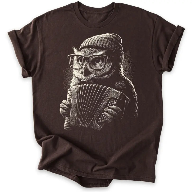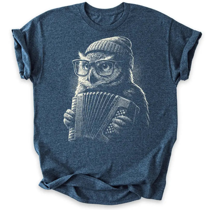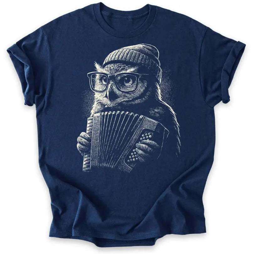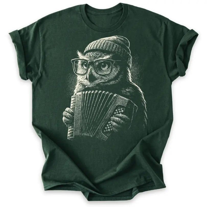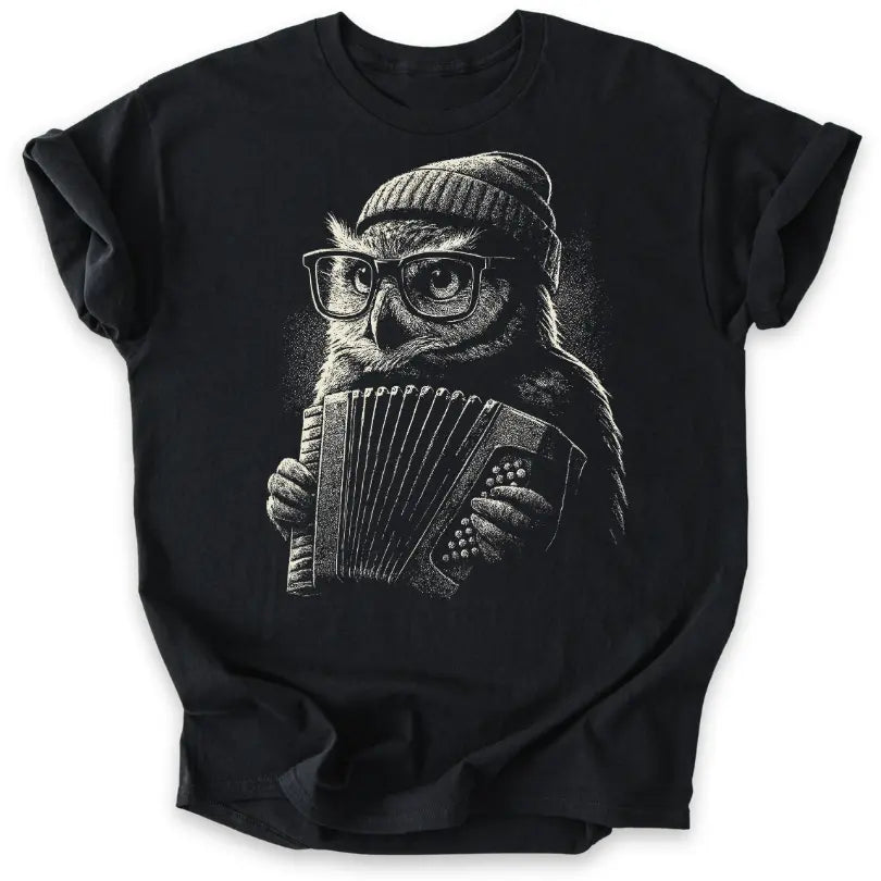 Schlau, stylisch und musikalisch – dieses T-Shirt bringt die Eule als coolen Akkordeonspieler ins Rampenlicht.