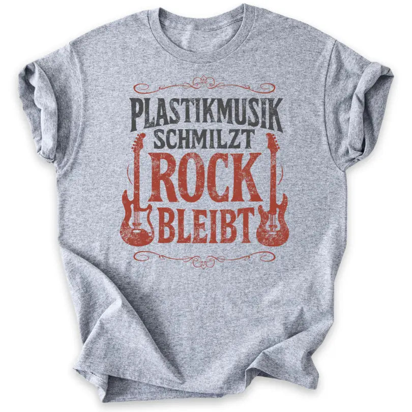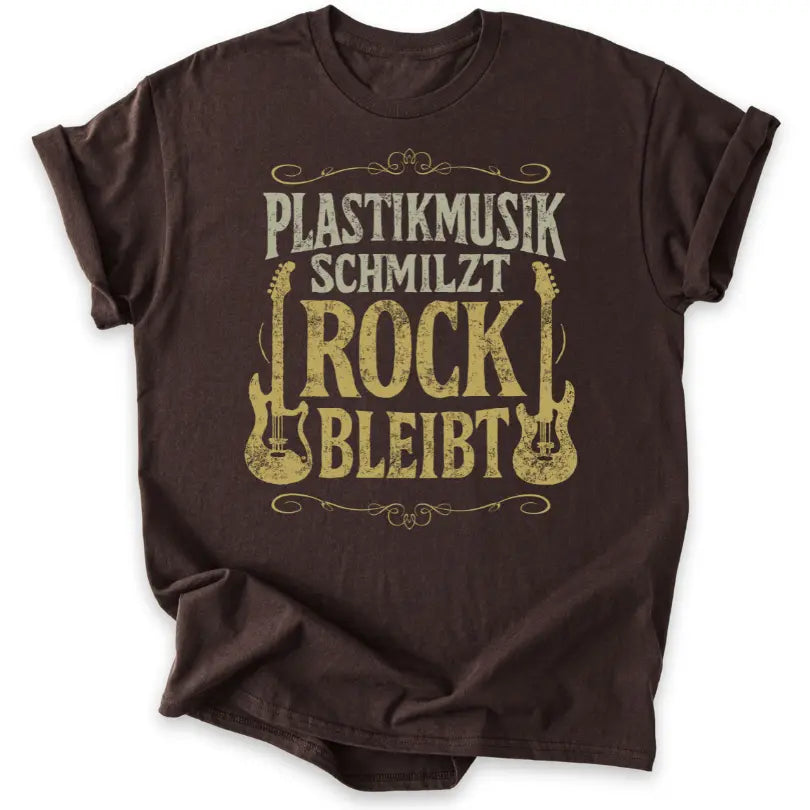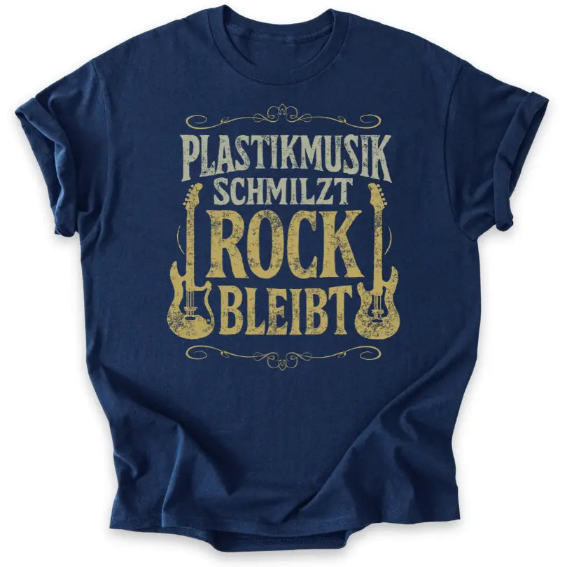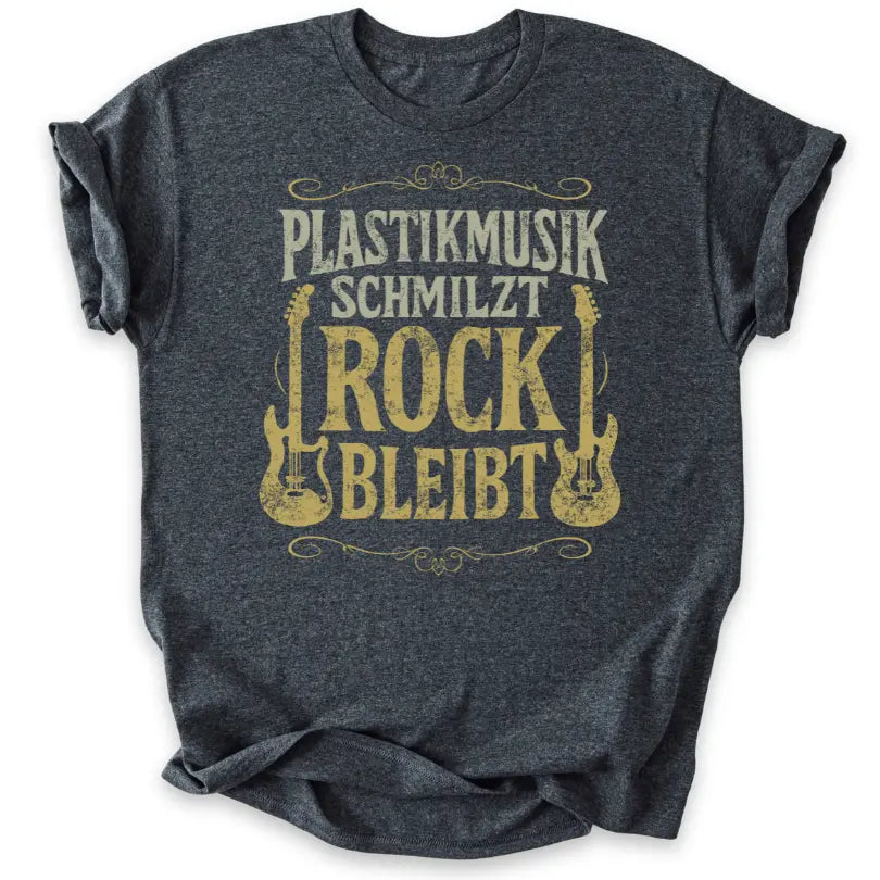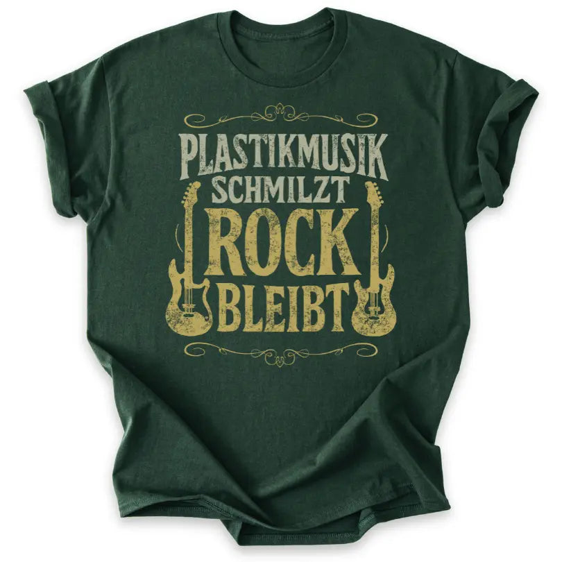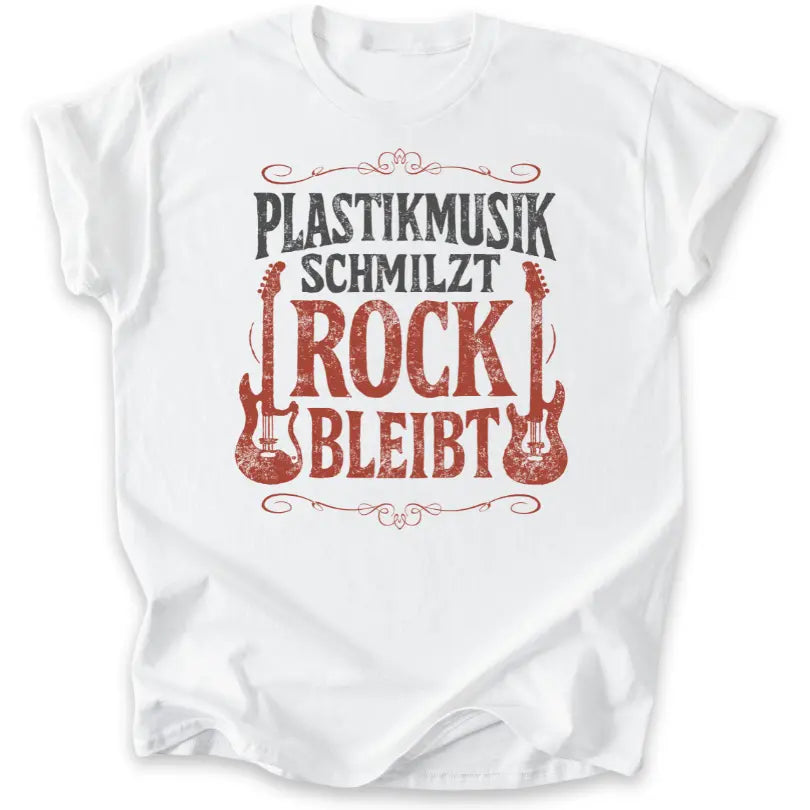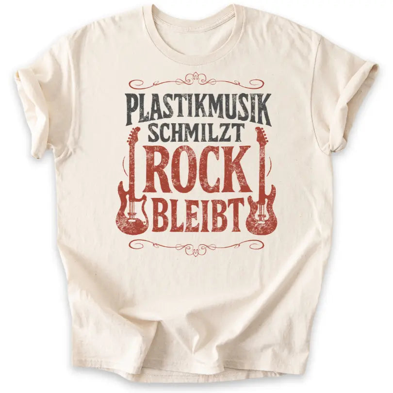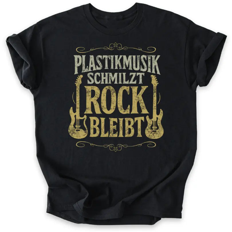 Trends vergehen, echter Sound bleibt. Dieses T-Shirt setzt ein klares Statement: Plastikmusik vergeht – Rock bleibt für immer.