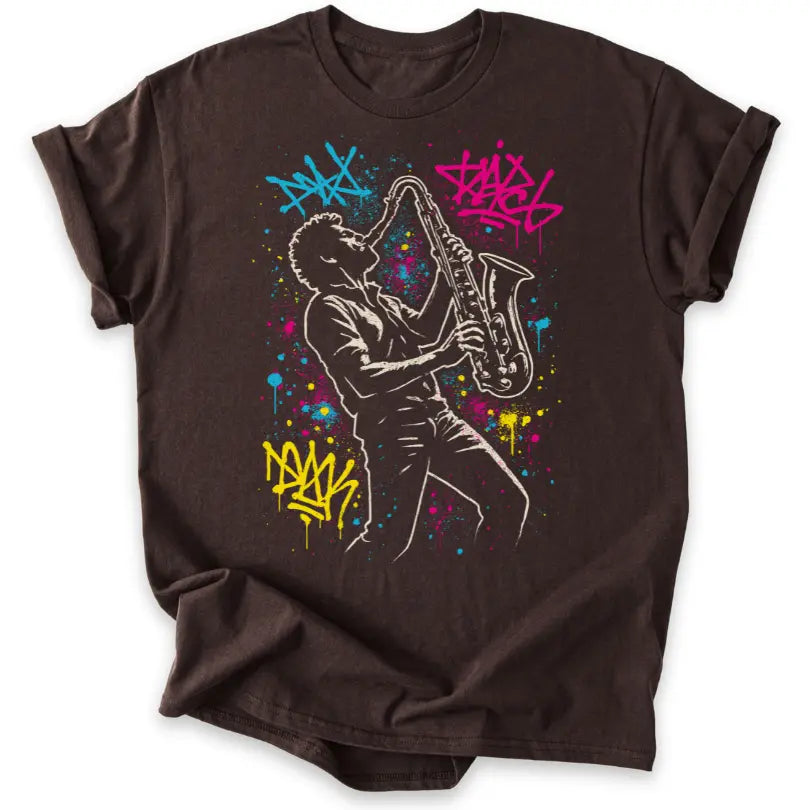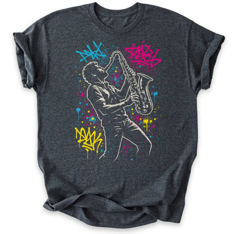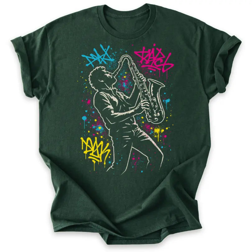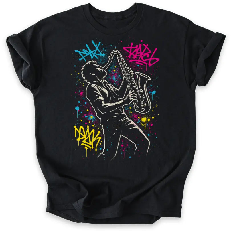 Jazz trifft Streetart – dieses T-Shirt bringt die wilde Energie des Saxophons in urbane Farben.