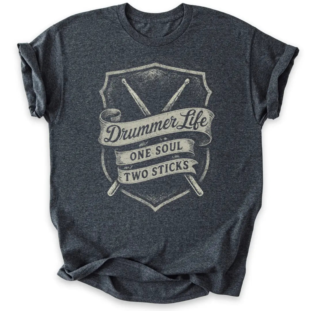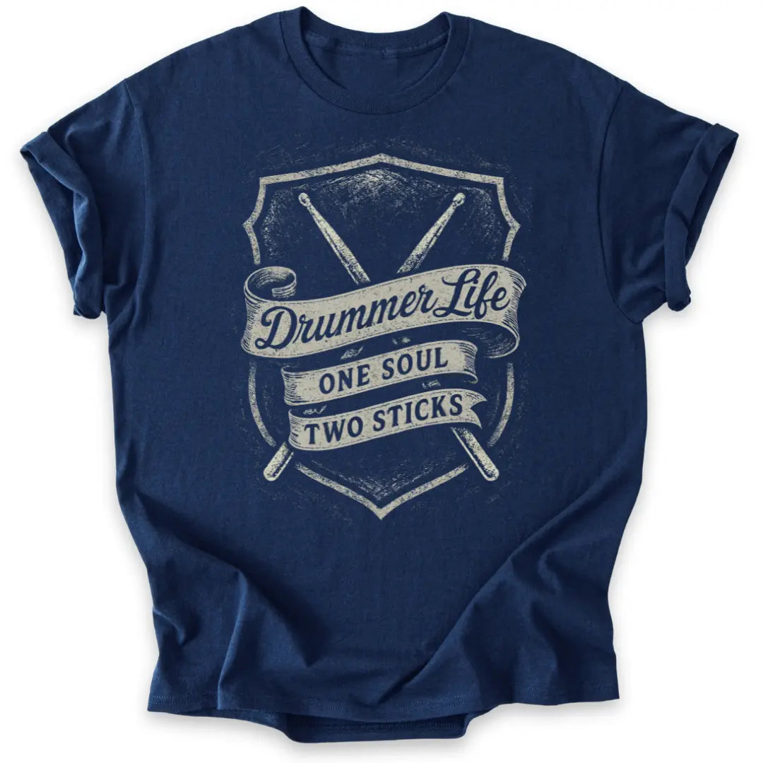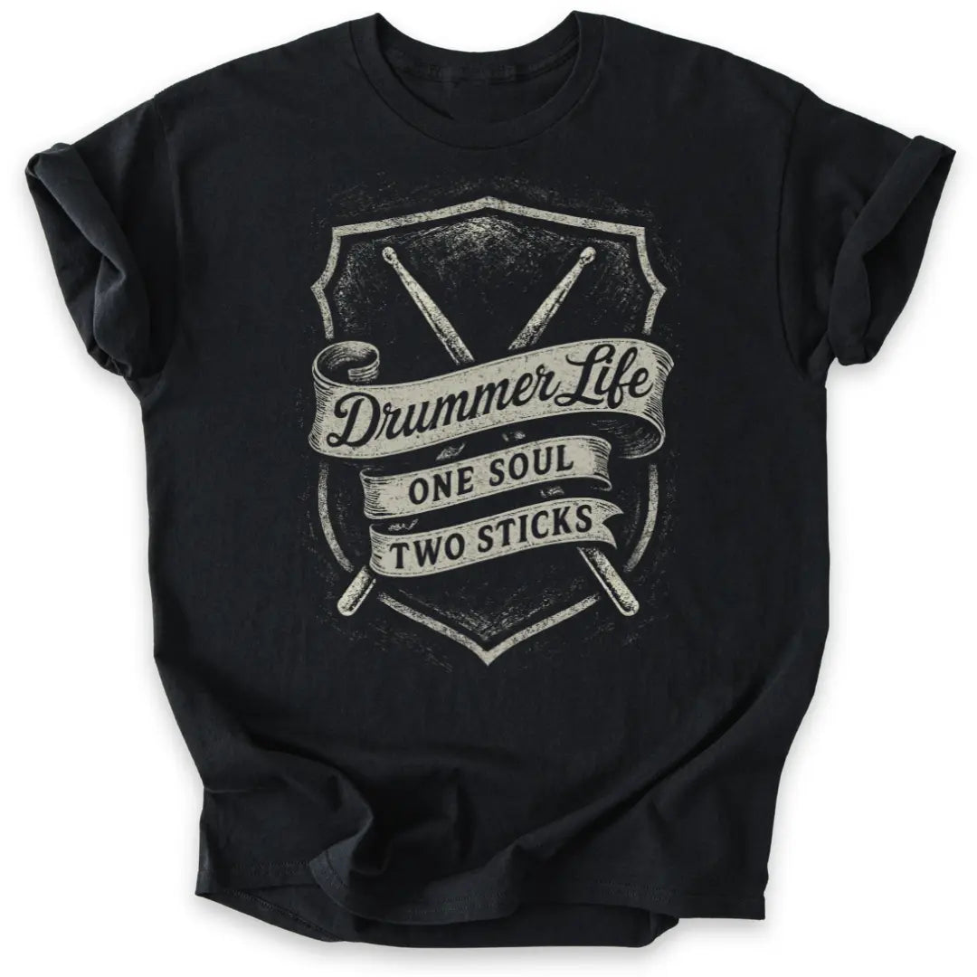 Mit klassischem Vintage-Banner, Drumsticks und der Message „One Soul – Two Sticks“ für echte Drummer-Seelen.