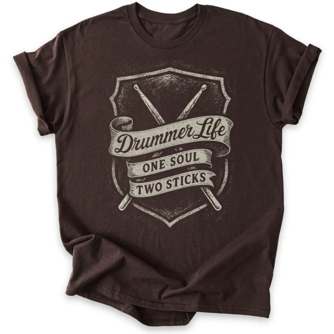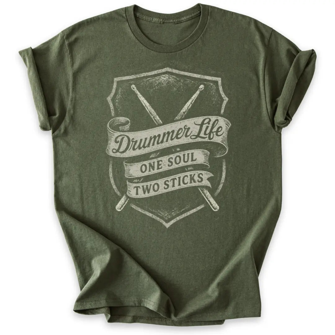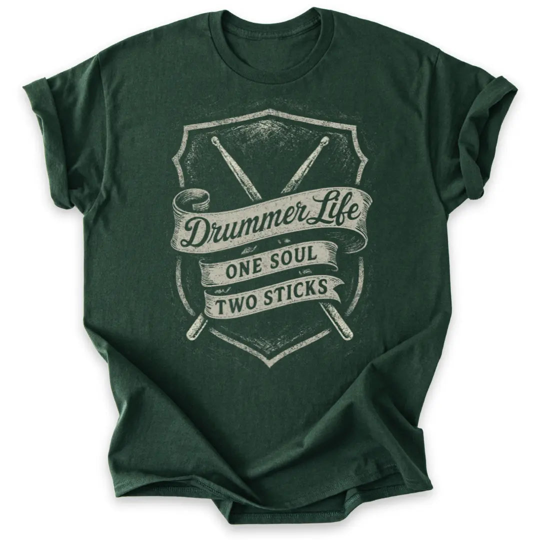 Mit klassischem Vintage-Banner, Drumsticks und der Message „One Soul – Two Sticks“ für echte Drummer-Seelen.