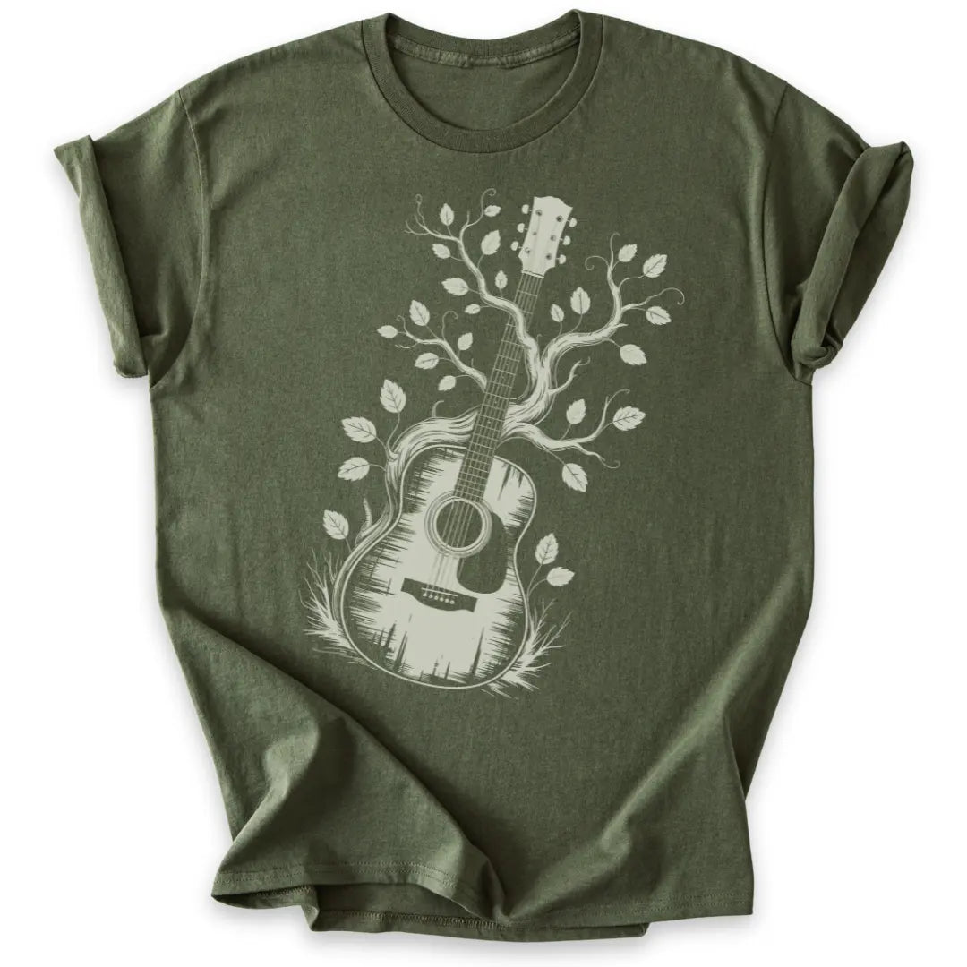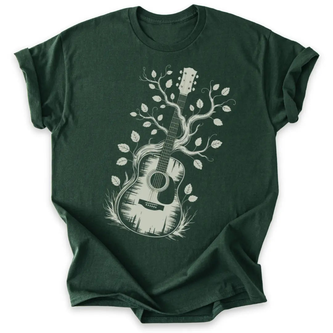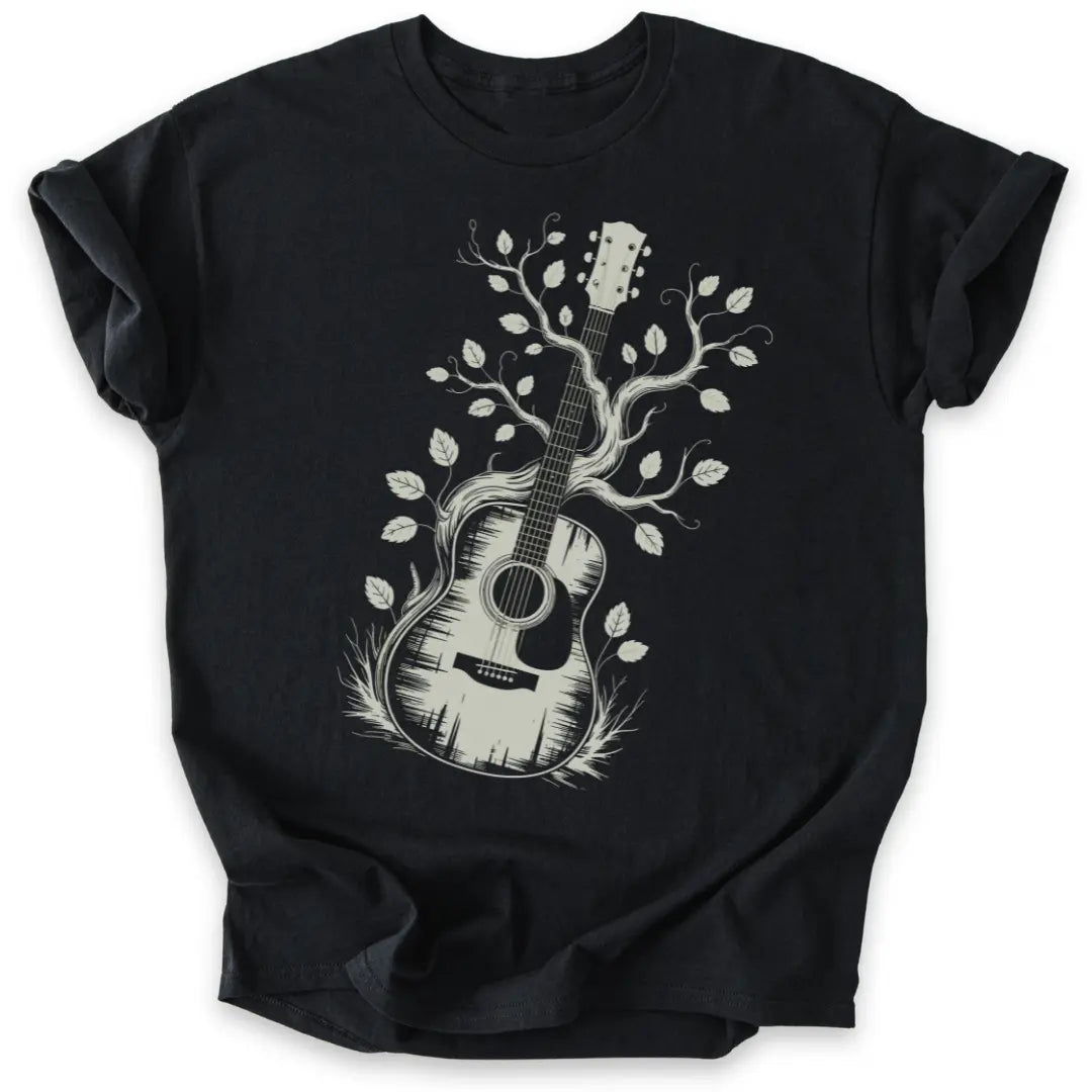 Dieses Shirt vereint Natur und Klang in einem künstlerischen Gitarren-Design.