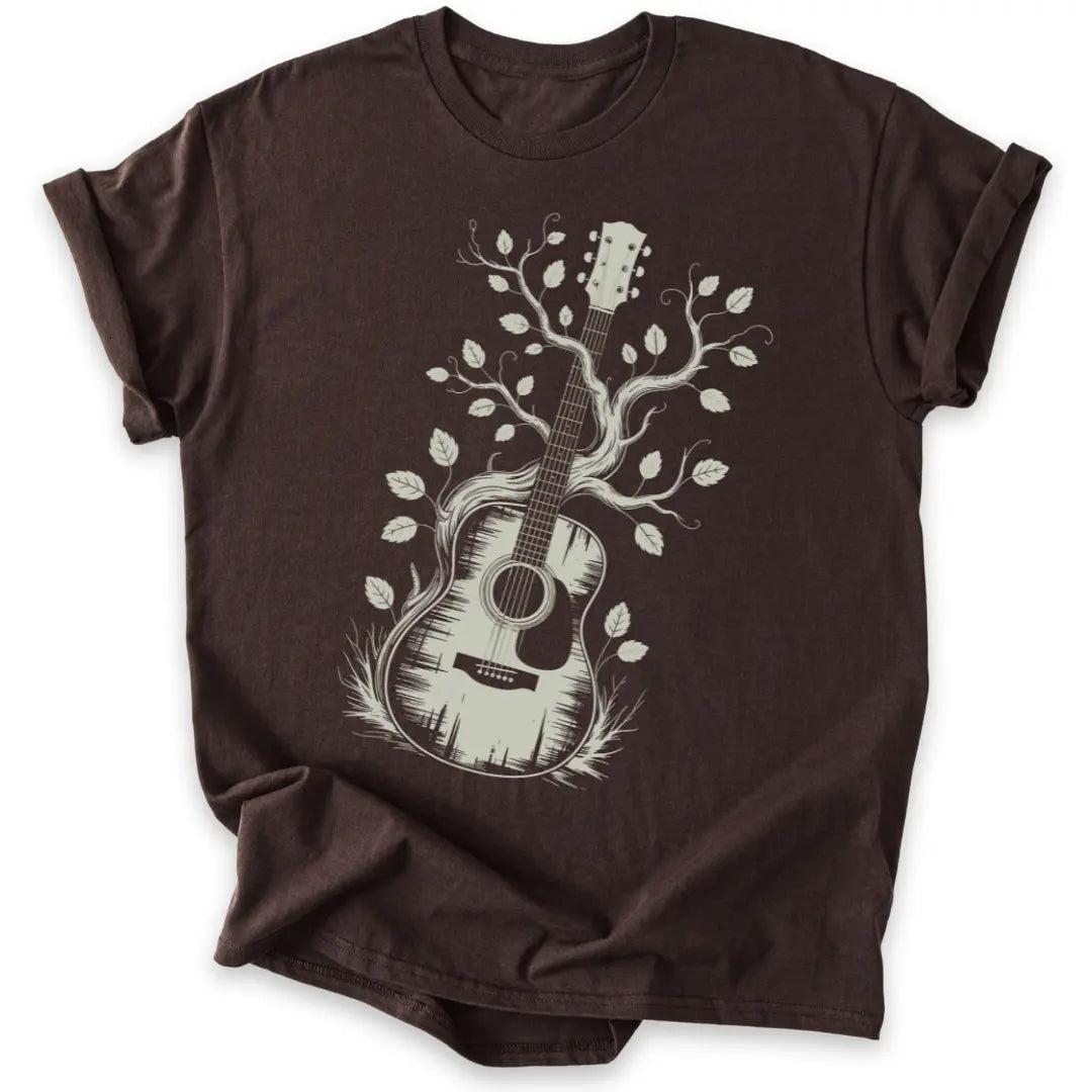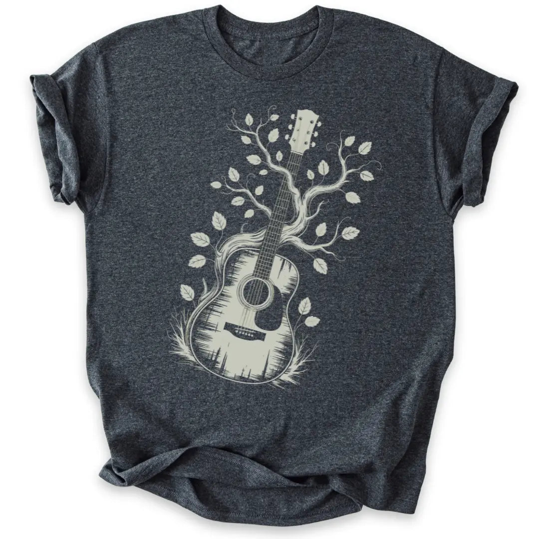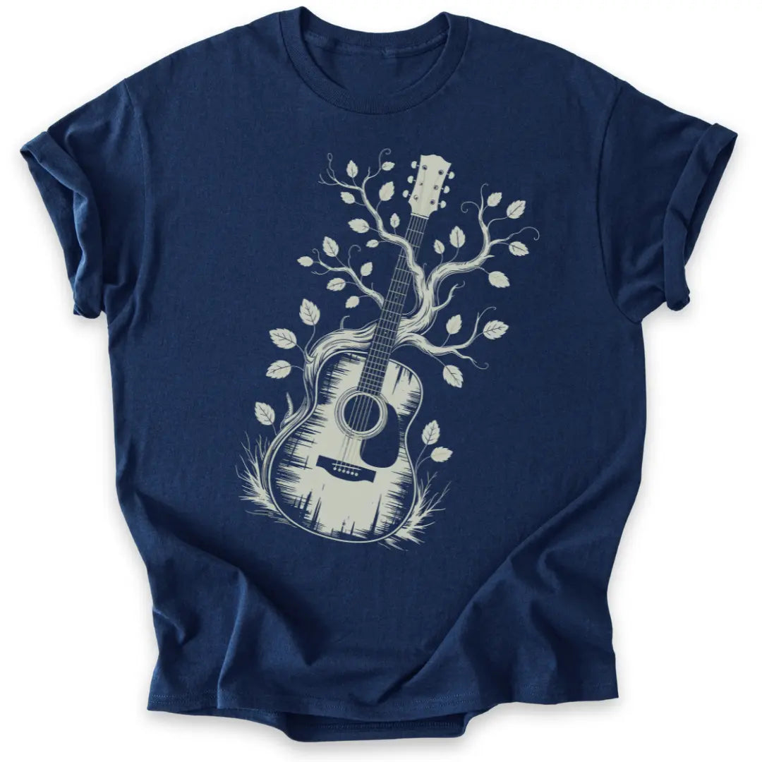 Dieses Shirt vereint Natur und Klang in einem künstlerischen Gitarren-Design.