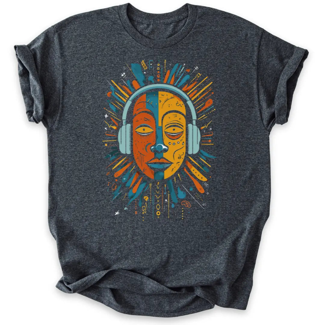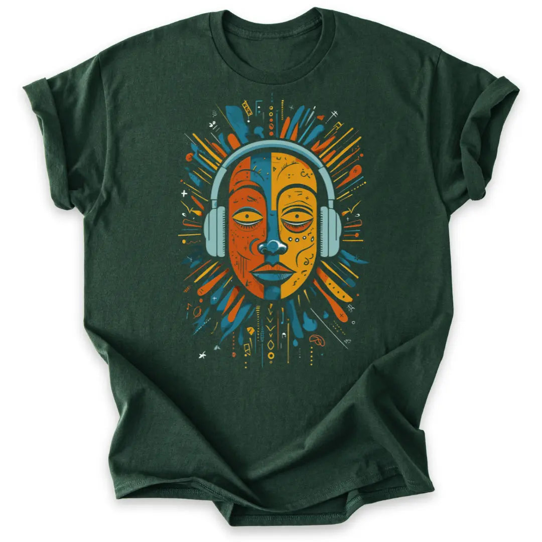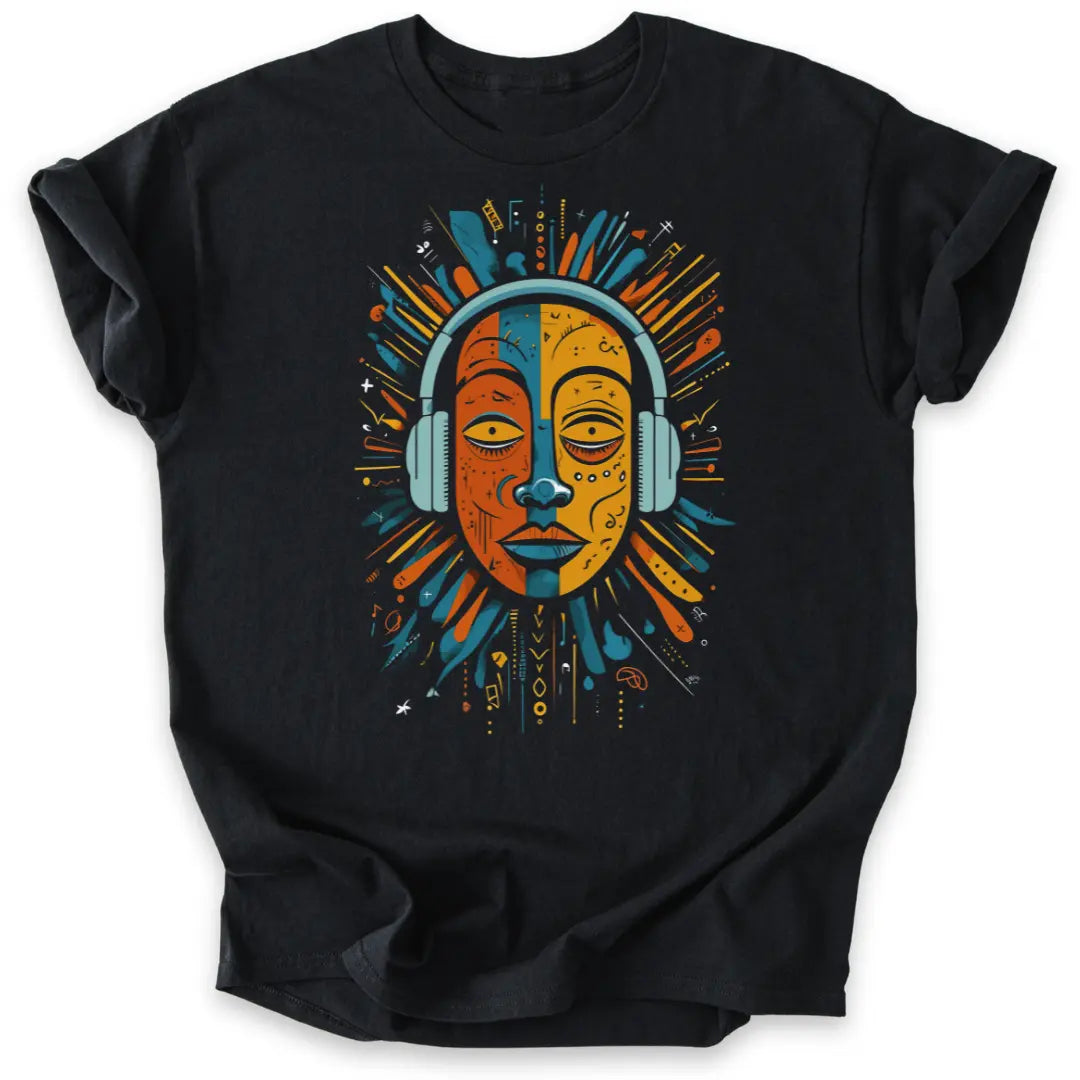 Dieses T-Shirt zeigt ein kraftvolles Maskenmotiv mit Kopfhörern, umgeben von bunten Rhythmen und Klangzeichen.