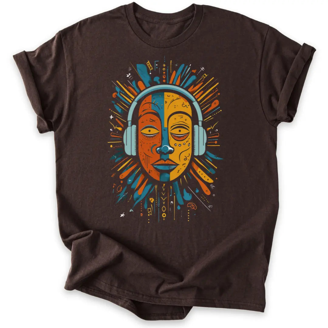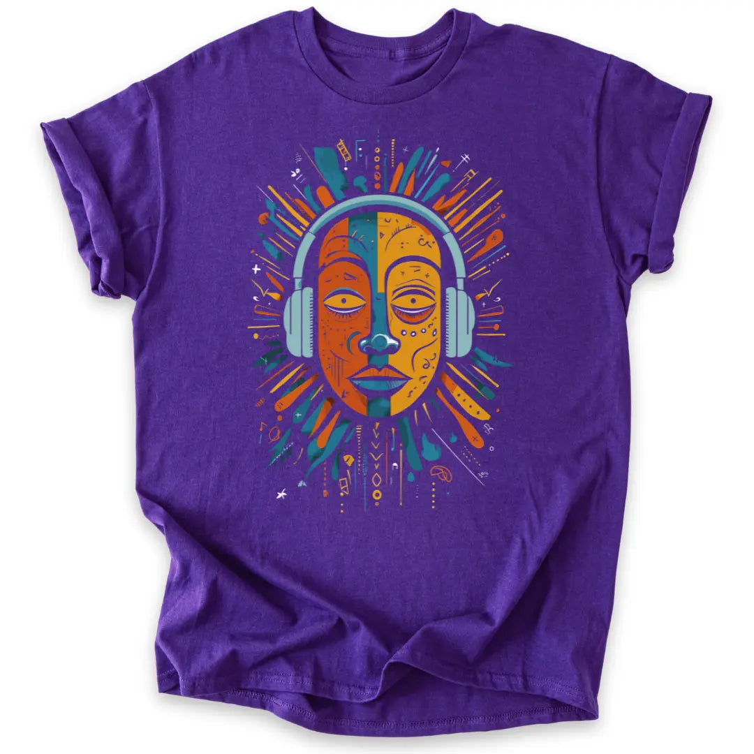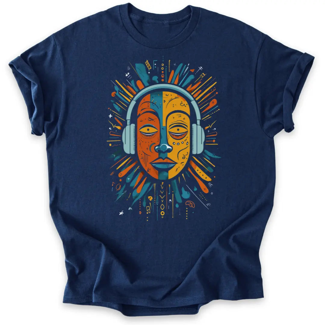 Dieses T-Shirt zeigt ein kraftvolles Maskenmotiv mit Kopfhörern, umgeben von bunten Rhythmen und Klangzeichen.