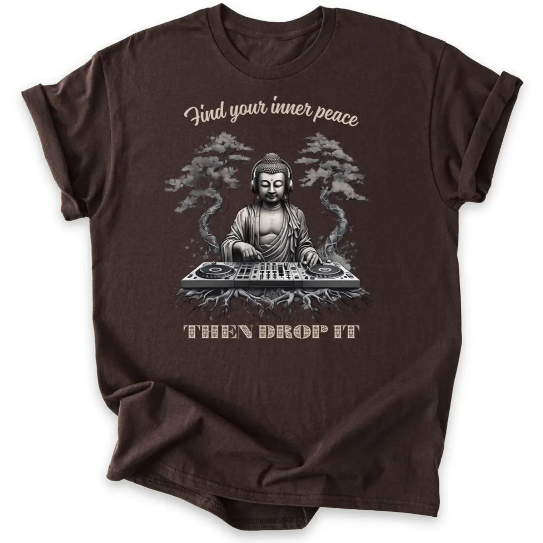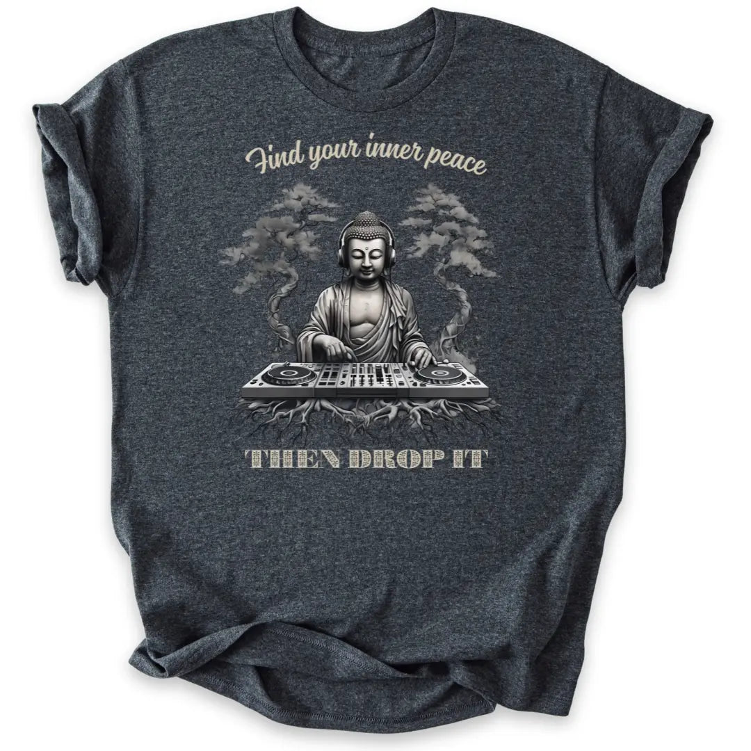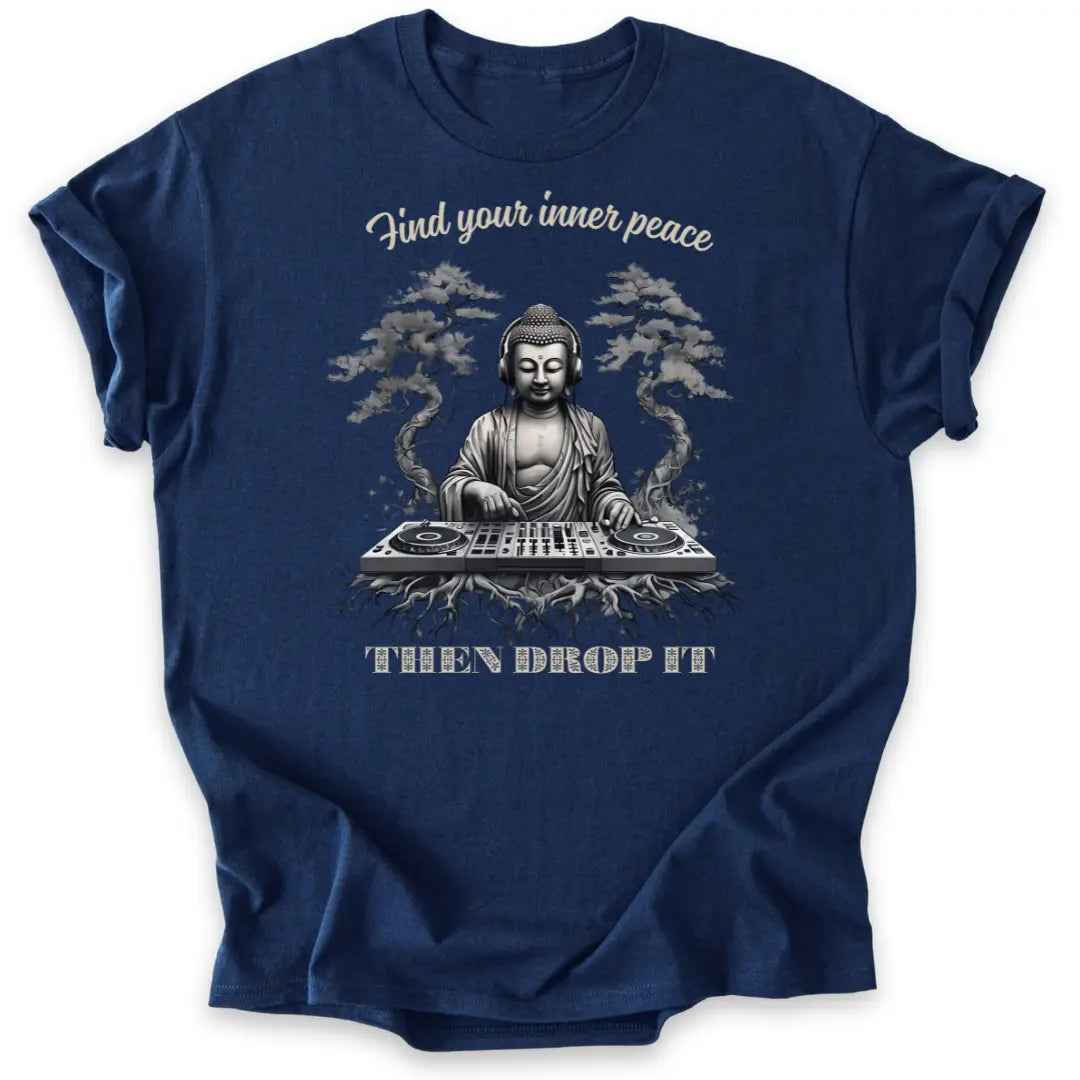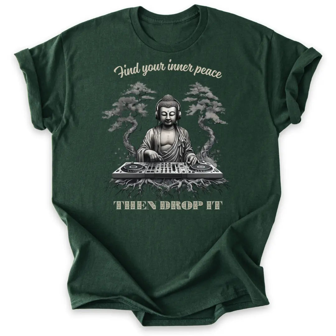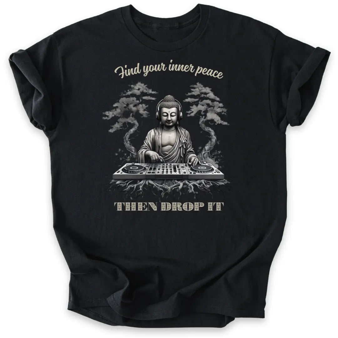 Dieses T-Shirt verbindet spirituelle Ruhe mit elektrisierender Energie: Buddha am DJ-Pult, umgeben von Bonsai-Bäumen und sattem Bass.