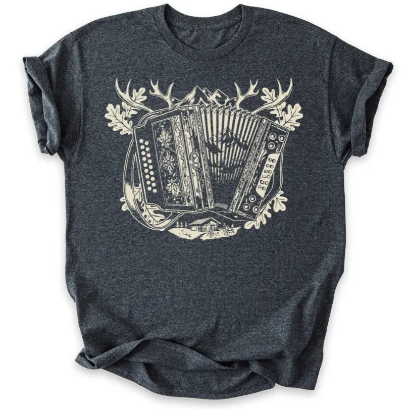 Hier klingt Heimat – dieses T-Shirt vereint den rustikalen Charme der Berge mit der Seele der Volksmusik.