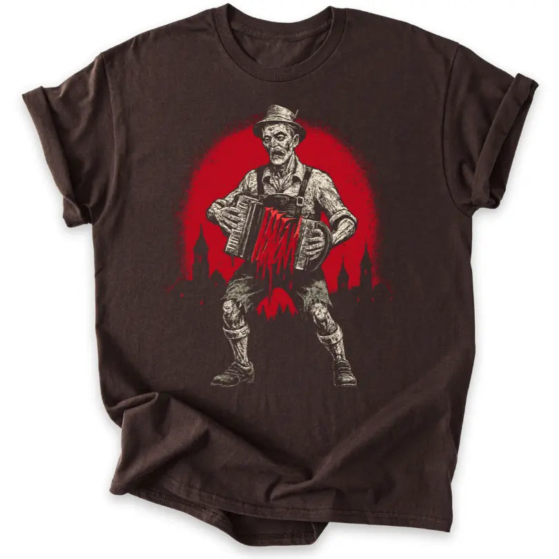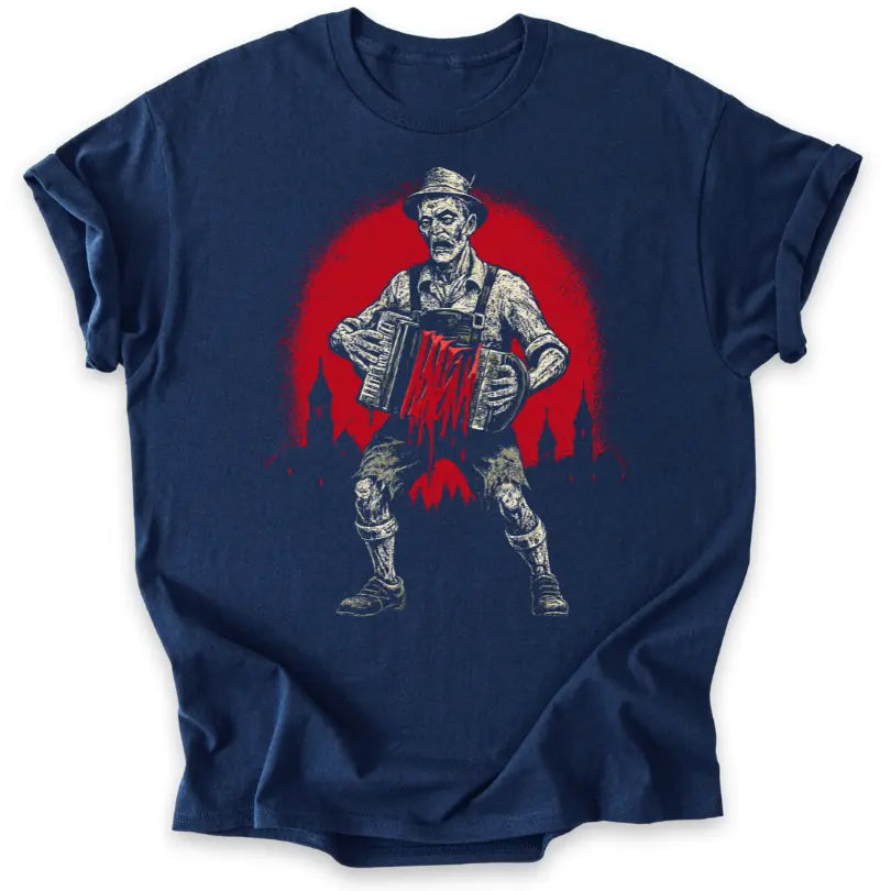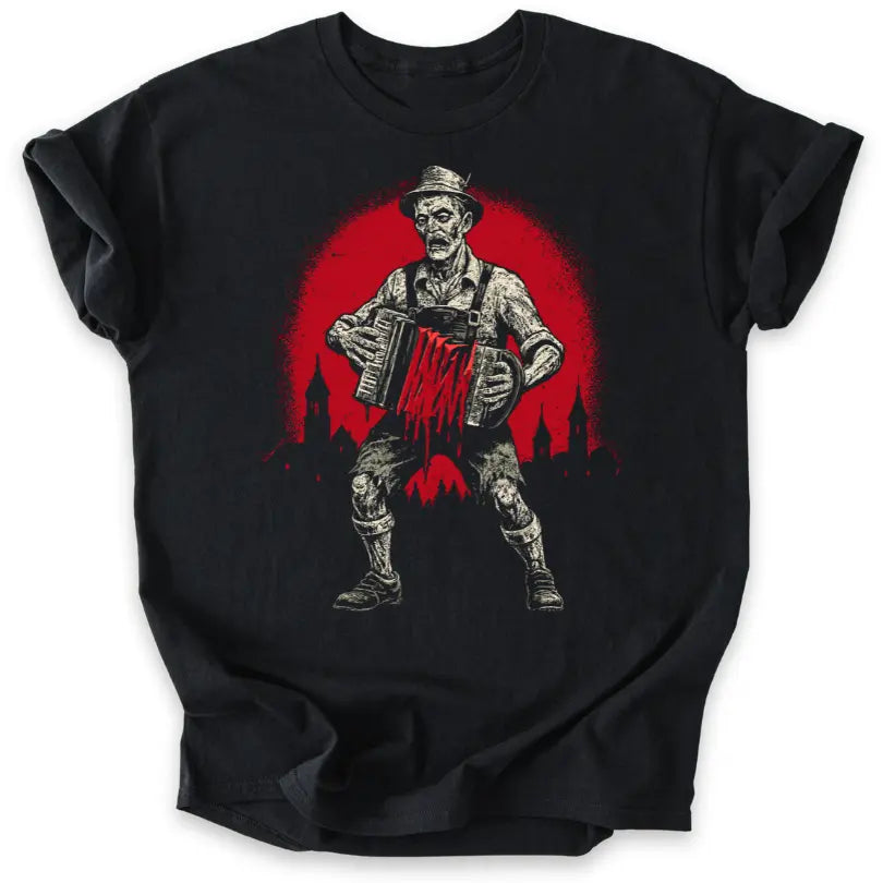 Wenn Volksmusik auf Horror trifft – dieses T-Shirt verwandelt das Akkordeonspiel in eine düstere Untoten-Show.